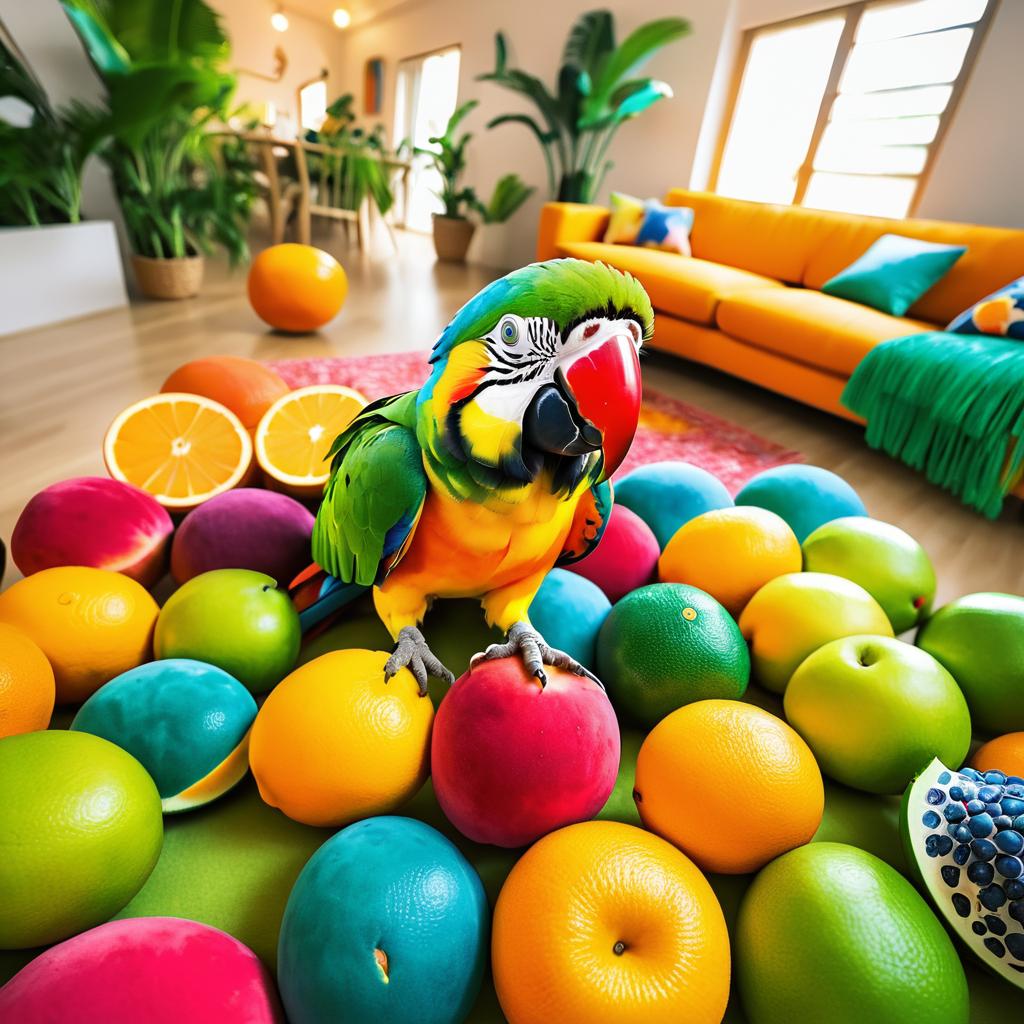 A cheeky parrot stealing a piece of fruit, trapped and looking up at the camera, standing in a vibrant living room with colorful cushions, wide-angle, top shot, photographed on Canon 18mm lens