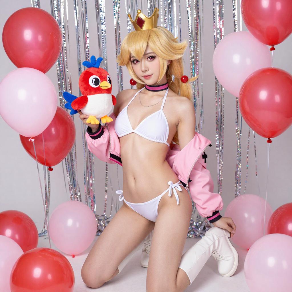 Digital artwork of a blonde cosplayer with a crown, wearing a pink frilled bikini, white thigh straps, and a blue pendant. She holds a Mario doll and stands among red and white balloons against a background of red and white striped streamers. Her makeup is bold with red lipstick.