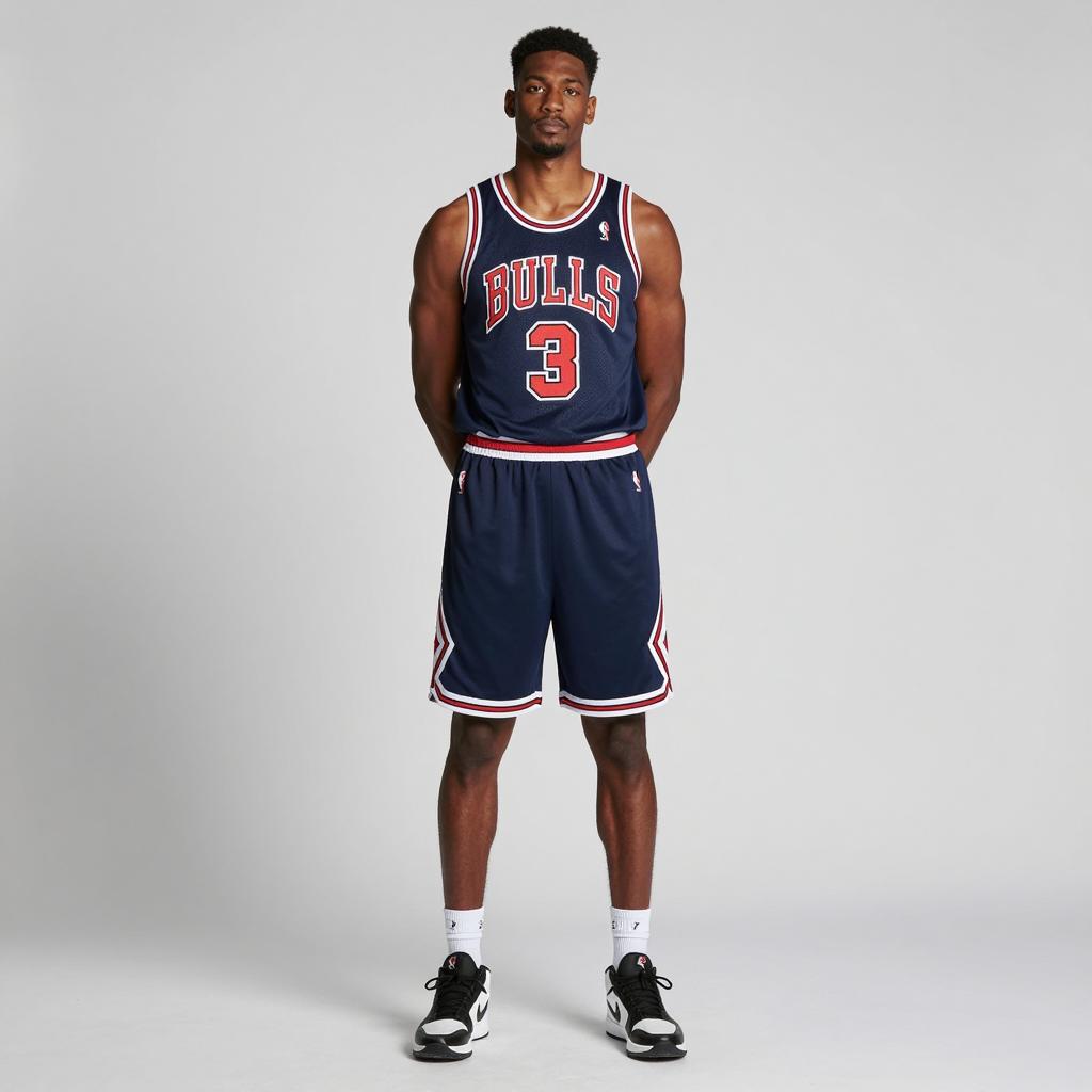 Full body studio portrait of a tall, muscular black man with short black hair wearing a dark navy blue Chicago Bulls basketball jersey with the number 3. He is also wearing matching basketball shorts, white socks, and black and white sneakers, standing straight with his hands behind his back against a gray background.