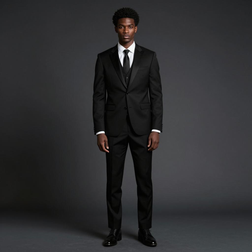 Basketball jersey dress, photograph of a tall, muscular black man, standing straight, wearing a dark navy blue basketball jersey with red trim and "Bulls" , black and white sneakers, white socks, short black hair, gray studio background, hands in pockets, full body shot, looking directly at camera, athletic build, neutral expression