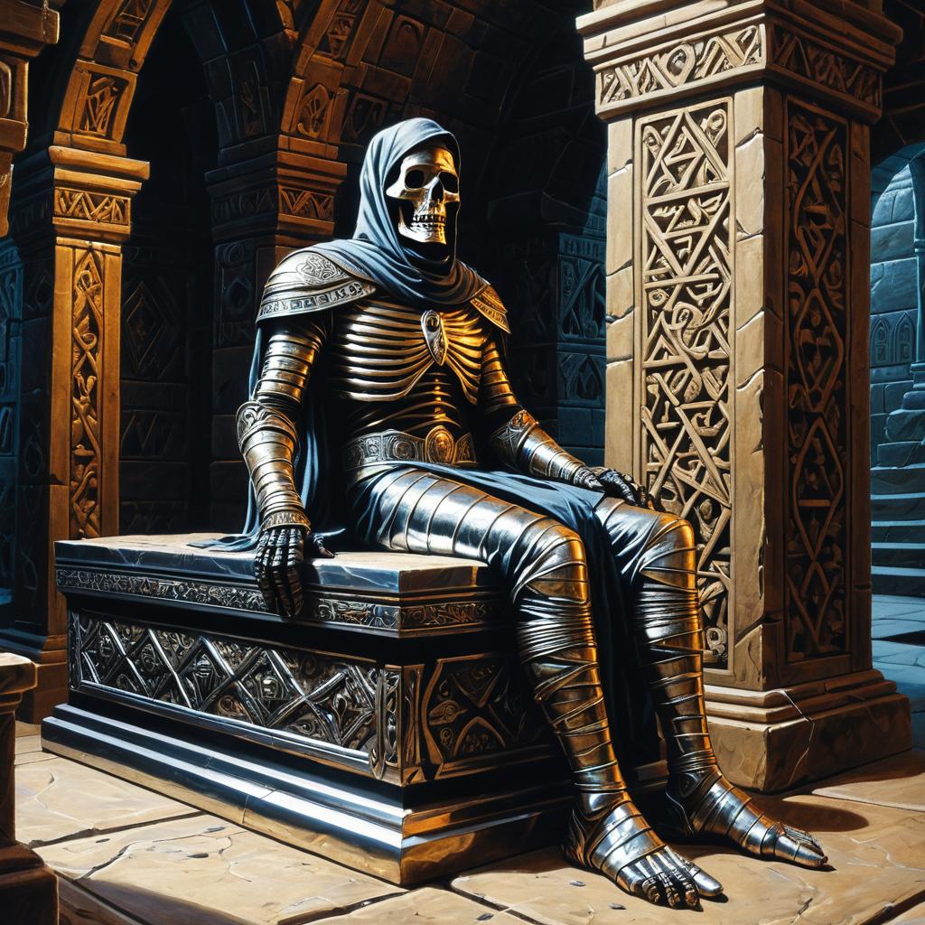 Digital illustration of an armored skeleton warrior wearing a dark hooded cloak, seated on an intricately decorated sarcophagus within a highly detailed, ornate stone tomb featuring carved pillars and arches. The setting has a medieval fantasy style, inspired by classic oil painting techniques.