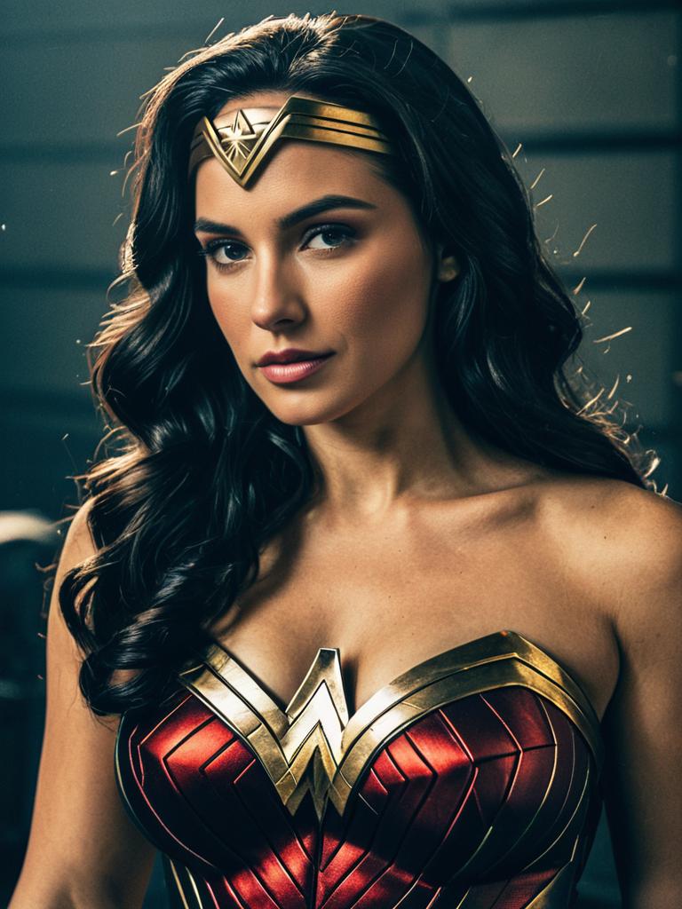 Woman in Wonder Woman costume, waist-up editorial superhero portrait, photorealistic tones
