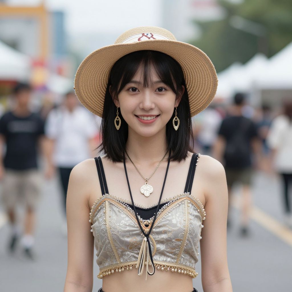 Photograph of an Asian woman with shoulder-length black hair, wearing a straw hat, silver crop top with gold trim, black straps, and dangling earrings
