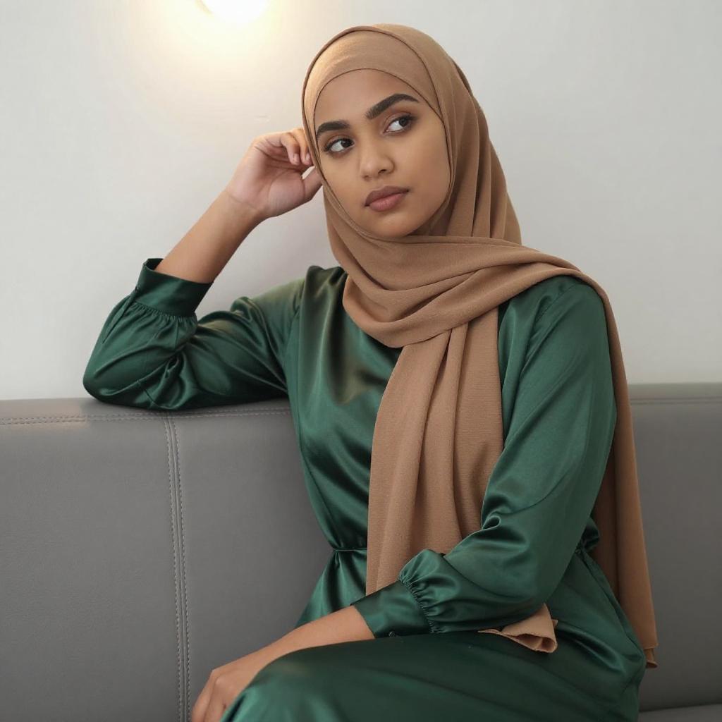 Photograph of a young woman with light brown skin and dark brown hair, wearing a brown hijab and a green satin dress with long sleeves. She sits on a gray leather bench, her right hand resting on her head, looking to the side with a thoughtful expression. A white light source is visible in the background.