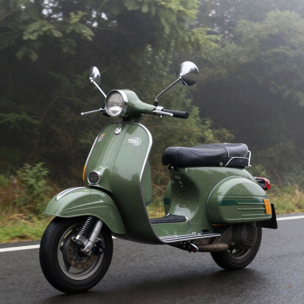 Photograph of a mint green vintage Vespa scooter on a foggy coastal road, with ocean and misty cliffs in the background.