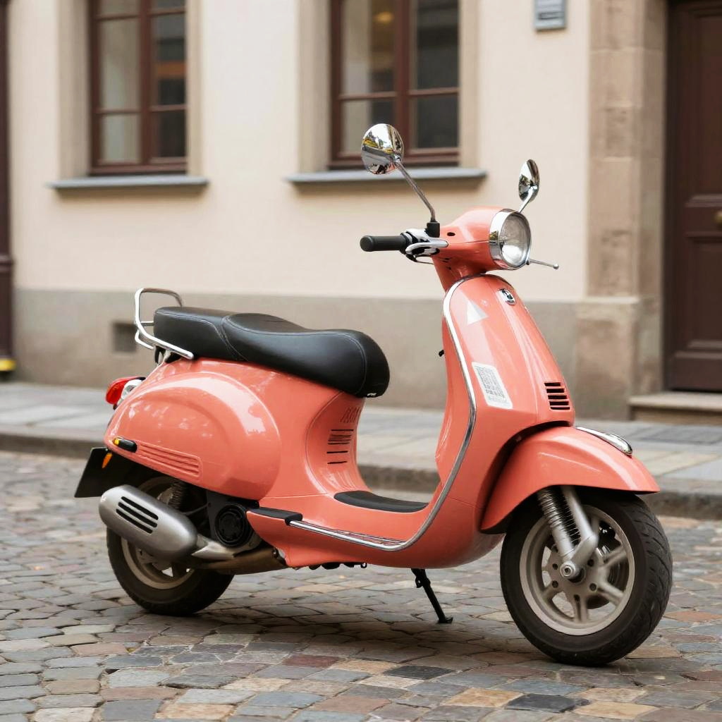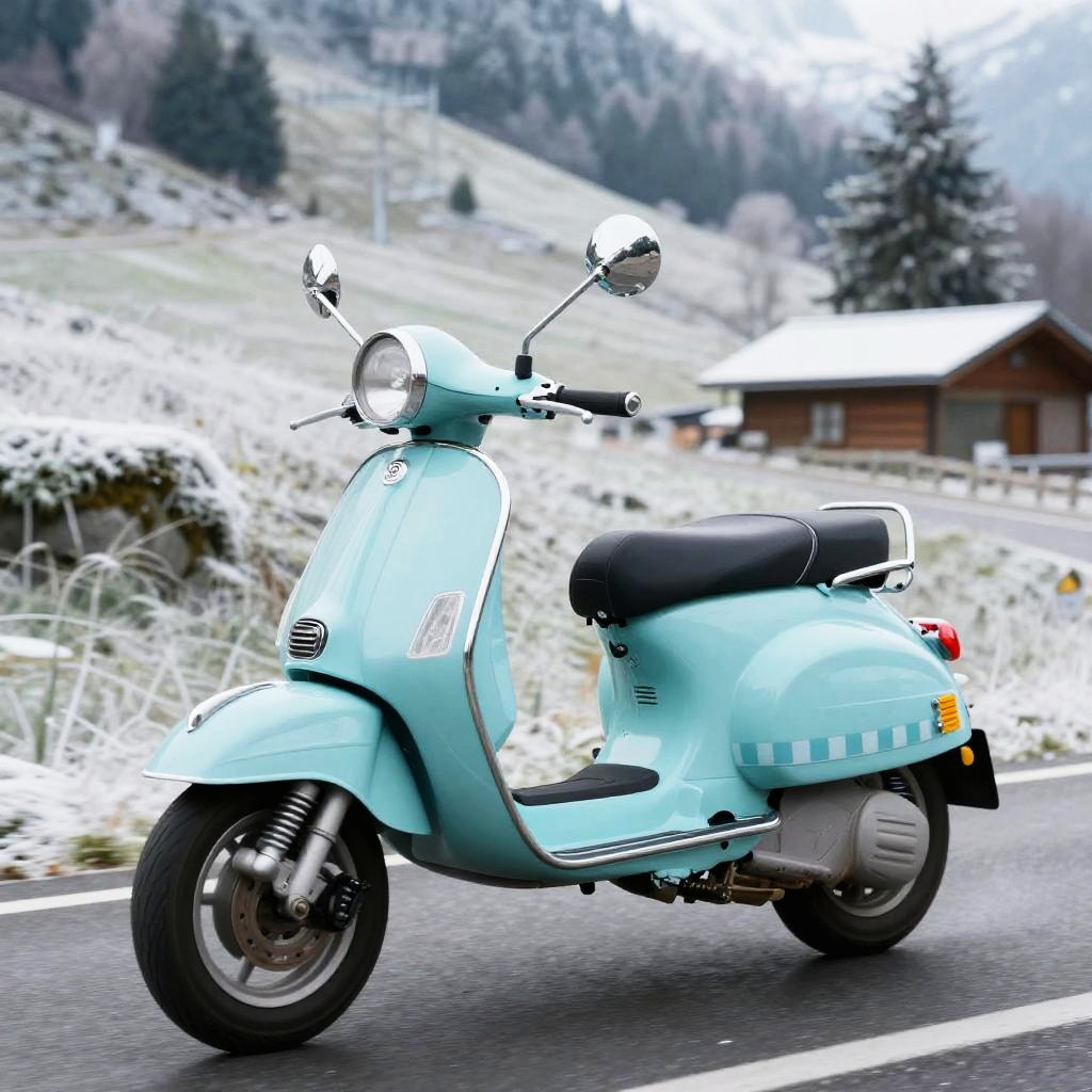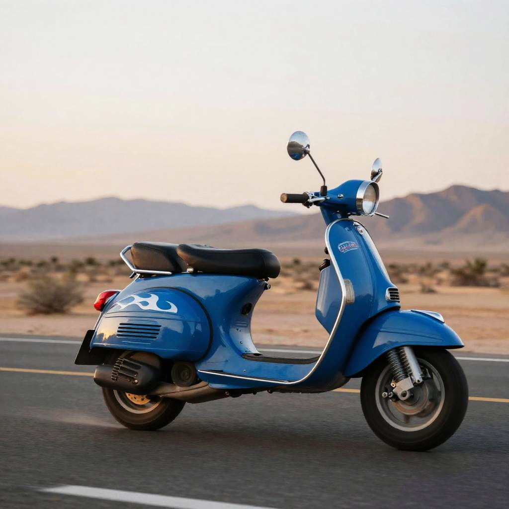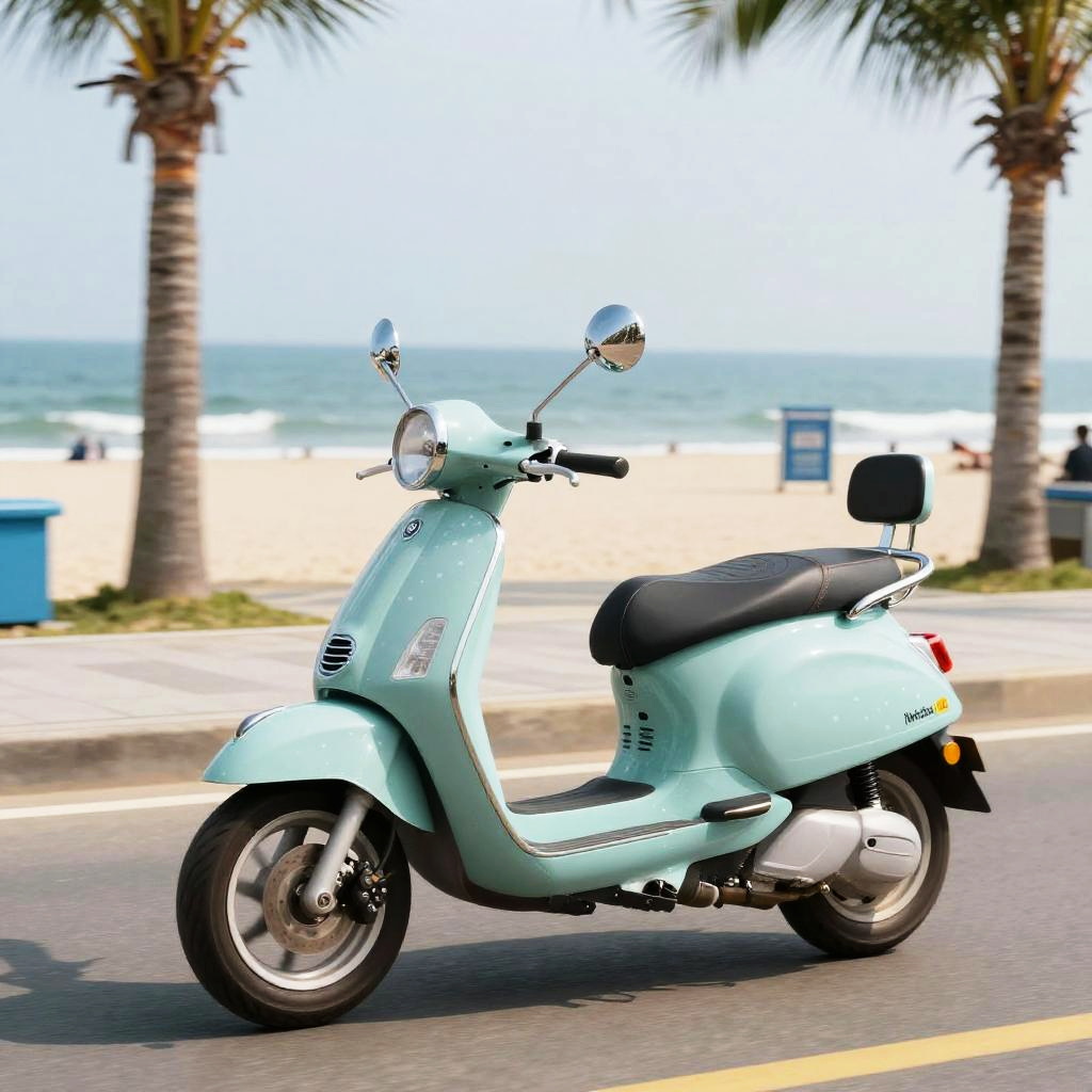 A classic moped in motion, painted mint green with racing stripes, speeding through a misty coastal highway.