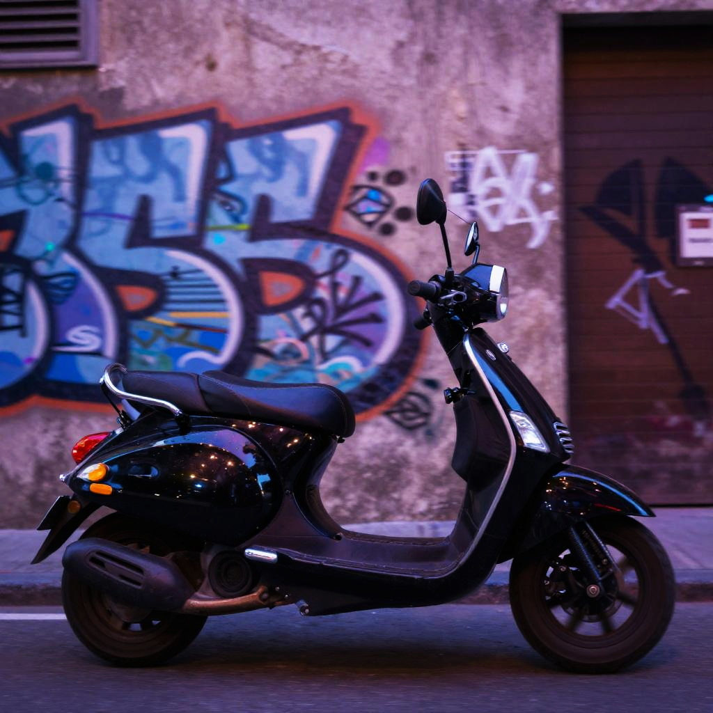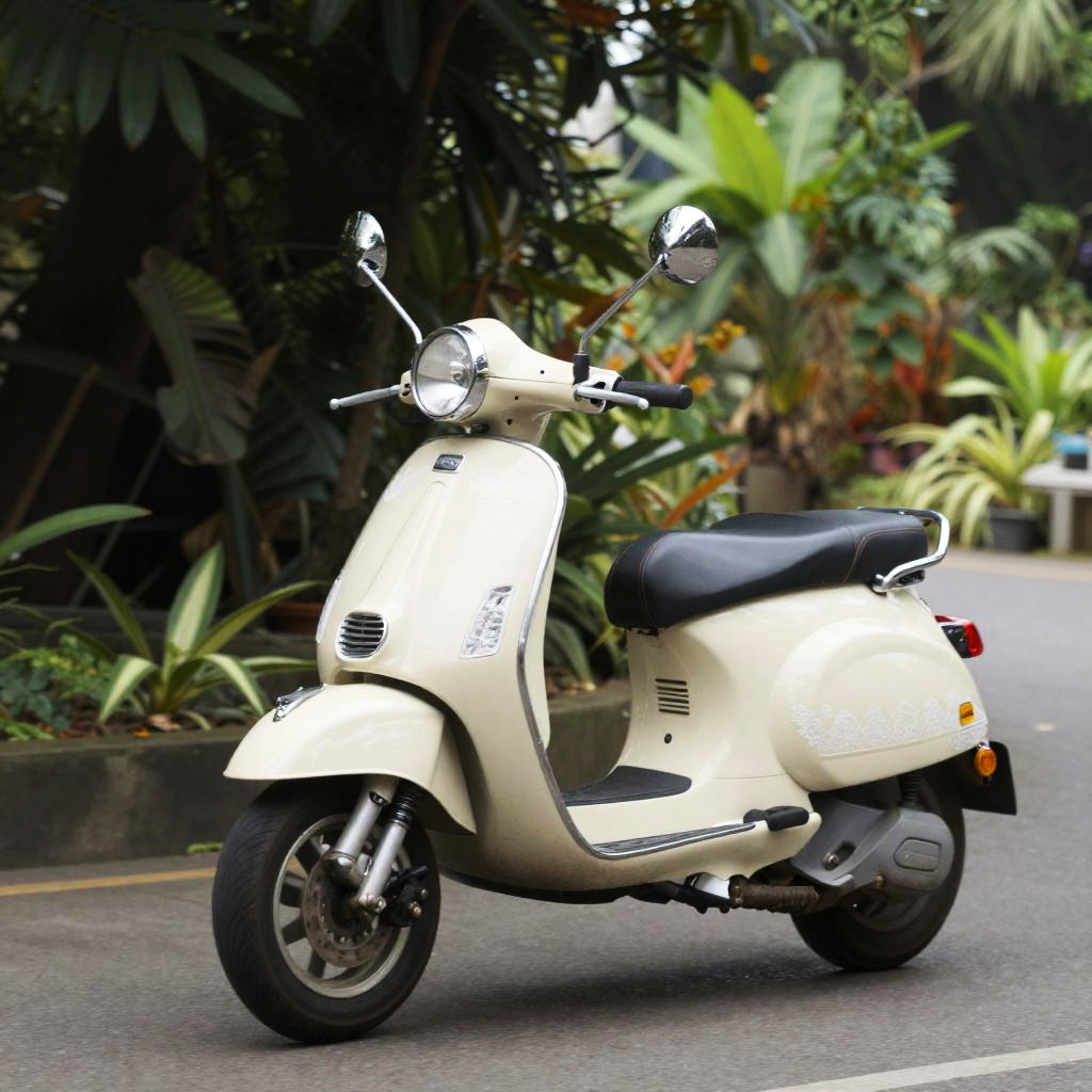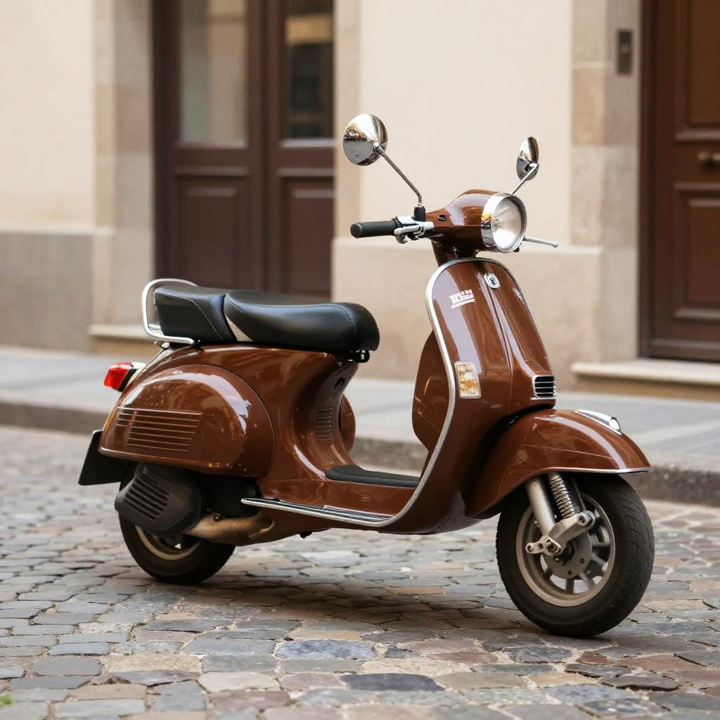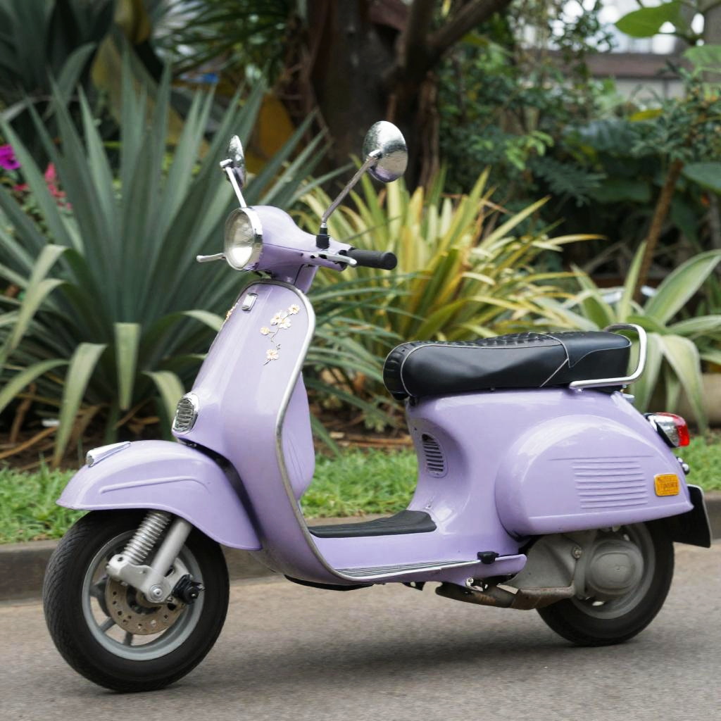 A classic moped in motion, painted mint green with racing stripes, speeding through a misty coastal highway.