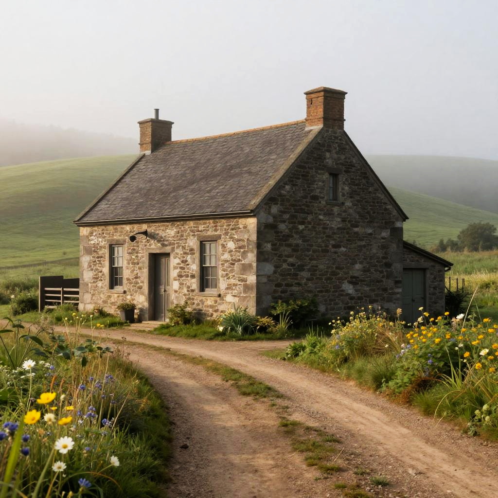 A picturesque stave and stable building beside a dirt path, surrounded by wildflowers and rolling hills, vintage rural architecture, early morning mist, tranquil scene