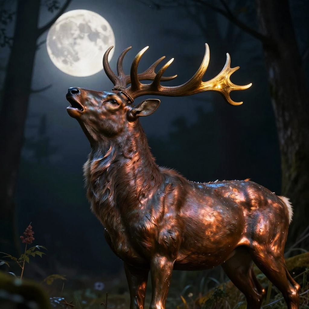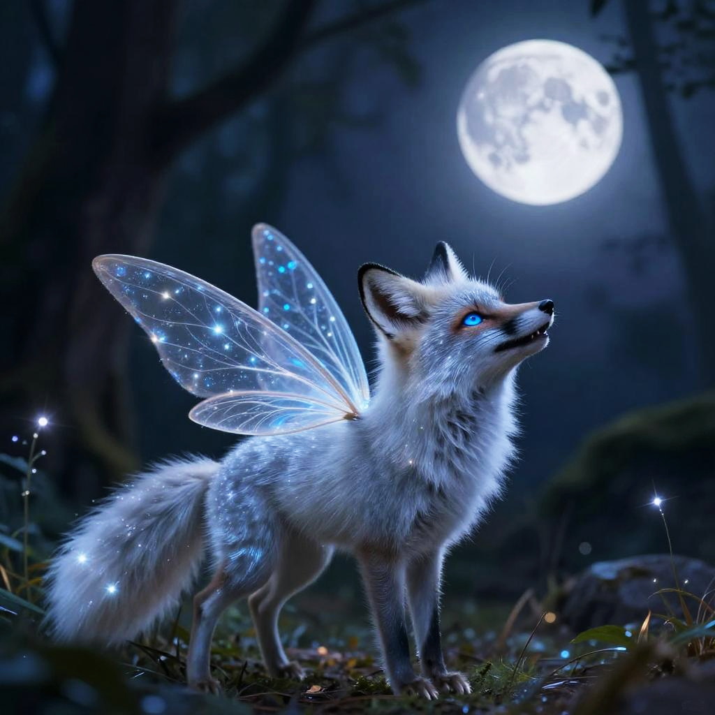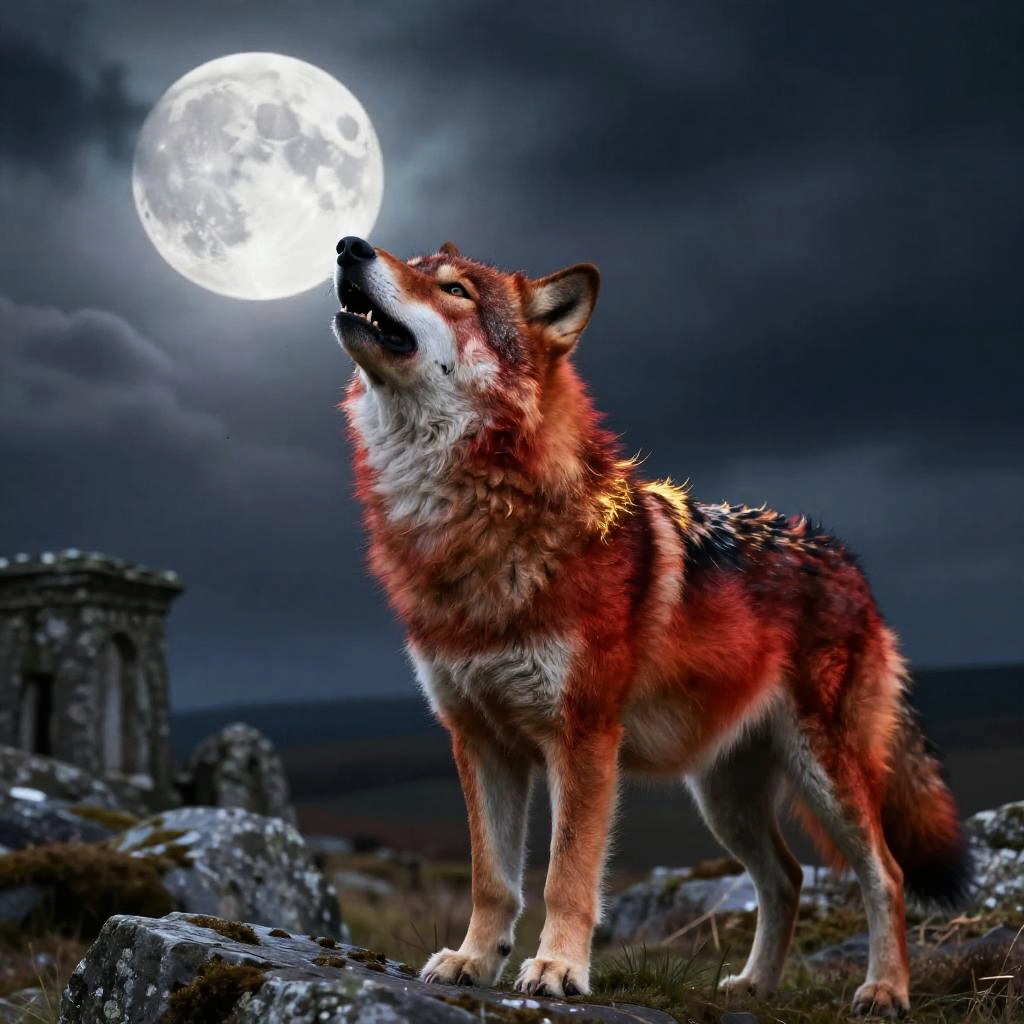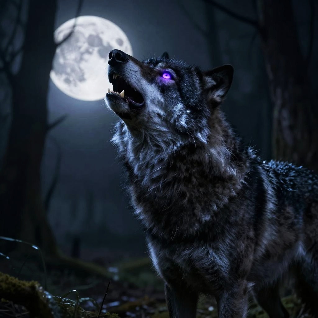 A mystical black wolf howling at the moon, with glowing violet eyes and misty silver fur accents, set in haunted moonlit swamp, featuring magical atmospheric lighting, detailed fur, haunting and serene ambiance