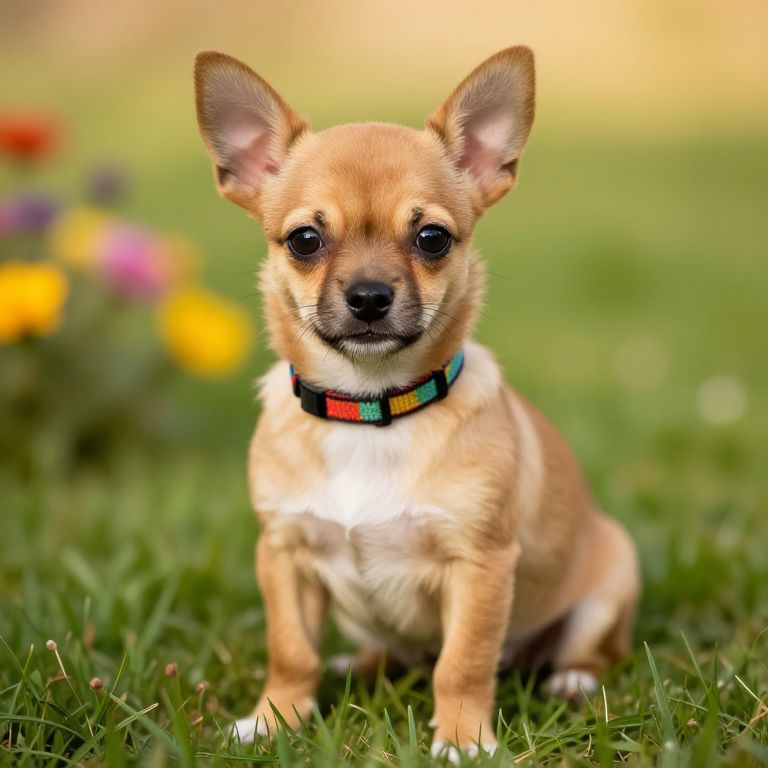 Photograph of a small, light brown Chihuahua with large, pointed ears and dark, expressive eyes. The dog has a white patch on its chest and wears a colorful collar with red, blue, and yellow patterns. It sits on lush green grass, with blurred, colorful flowers in the background, creating a soft bokeh effect. The sunlight highlights the dog's fur, giving it a warm, natural glow. The Chihuahua looks directly at the camera with a gentle, curious expression. The background is slightly out of focus, emphasizing the dog as the central subject.