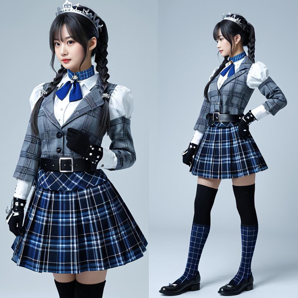 Masterpiece, best quality, highres, sui1, 1girl, solo, side ponytail, hoshimachi suisei, fingerless gloves, single thighhigh, jewelry, single sock, thigh strap, bracelet, blue socks, buttons, single kneehigh, plaid dress, blue choker, blue belt, plaid skirt, mini crown, grey skirt, blue ascot, long sleeves, plaid jacket, cowboy shot