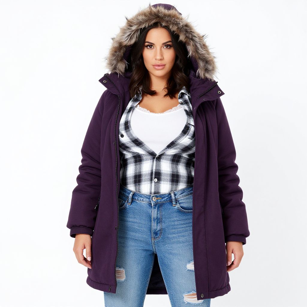 "Woman, casual contemporary, knee-length parka in dark purple, faux fur-lined hood with taupe fur, long sleeves, buttoned front closure, flannel shirt in black-and-white checkered pattern, lace-trim white tank top underneath, blue denim jeans, distressed at the knees, white background with a studio setting.. Sexy. Pretty face and beаutiful eyes. Big breasts."