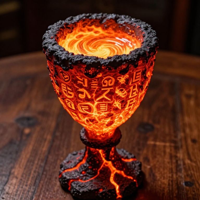 A hyper-realistic portrait, photorealistic photo close-up image of A chalice forged from molten lava, its surface perpetually shifting and flowing like a living, fiery river, The body of the chalice is smooth, with glowing orange and red patterns resembling ancient runes, constantly appearing and disappearing as the lava moves, The rim is edged with a blackened, obsidian-like material that contrasts sharply with the molten liquid within, Inside the chalice, a swirling vortex of liquid fire dances, its heat palpable even from a distance, The base is heavy, with veins of glowing magma coursing through the stone, grounding the otherwise fluid object in the physical world, The chalice stands on a wooden medieval table photography, dynamic, energetic, dramatic lighting, shallow depth of field