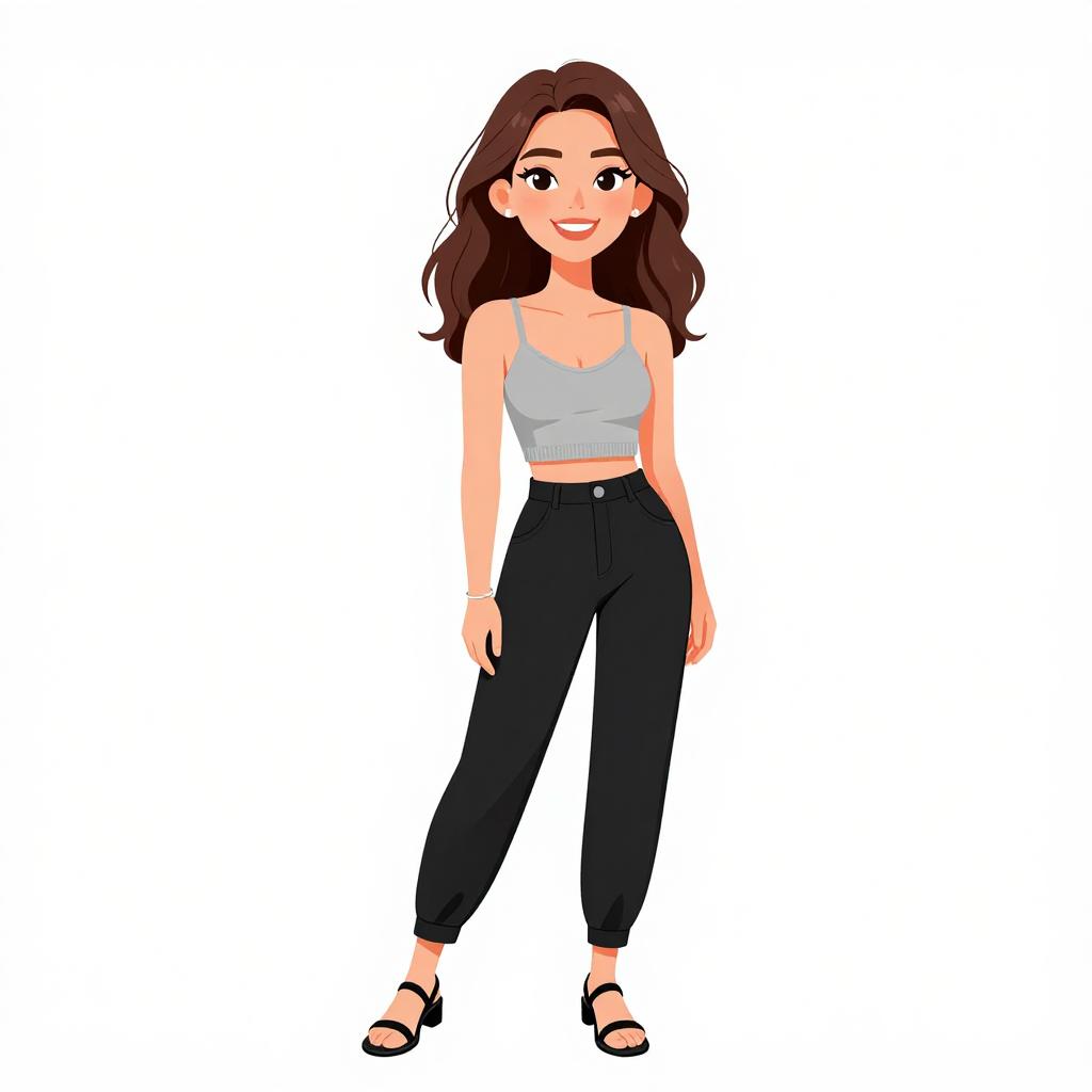 Woman with pretty face and pretty hair. smiling Woman, minimalist, cropped knit tank top in heather grey, scoop neckline, spaghetti straps, high-waisted black trousers, relaxed fit, slightly tapered leg, pockets, black strappy flat sandals, delicate silver bracelet, white studio background. --sref 1467