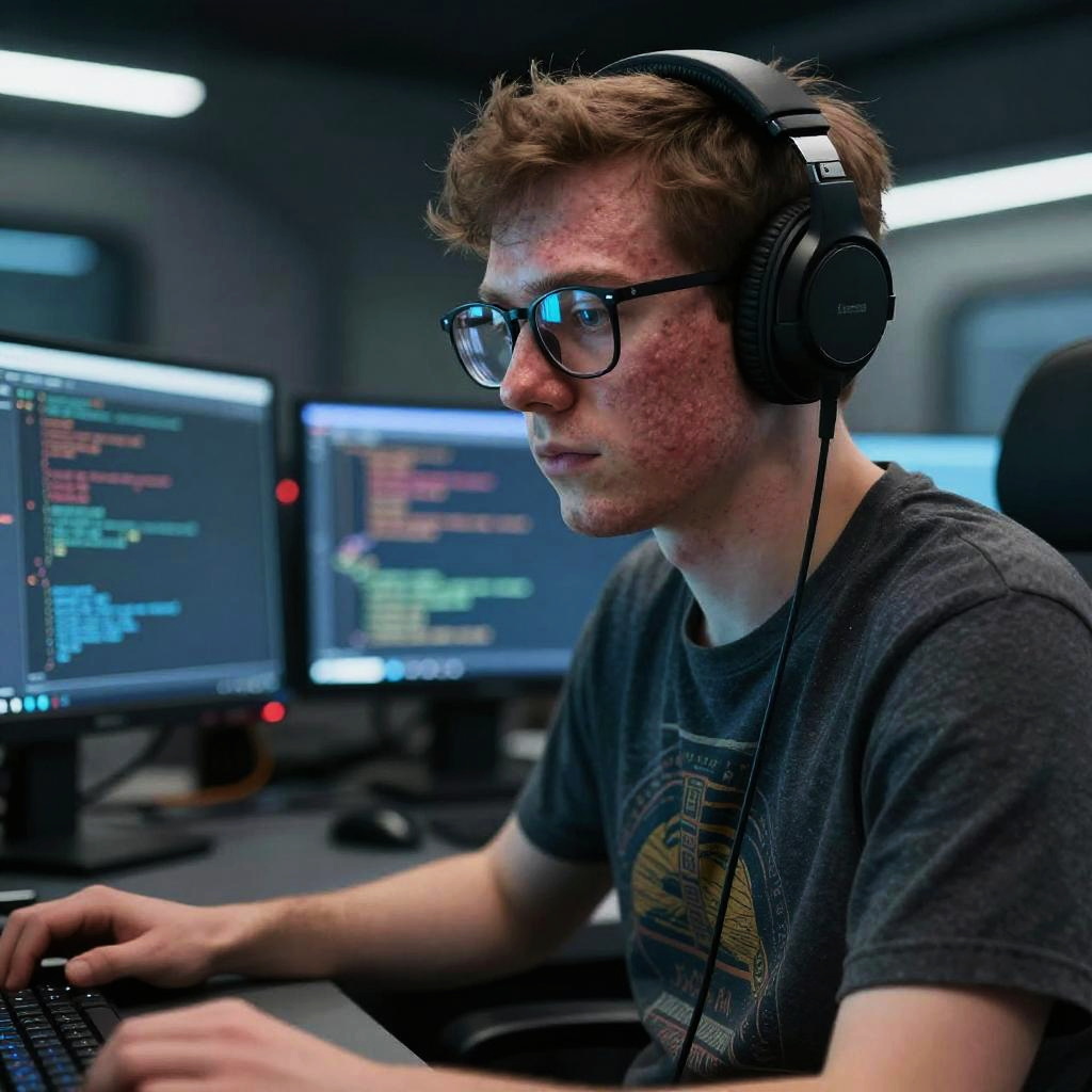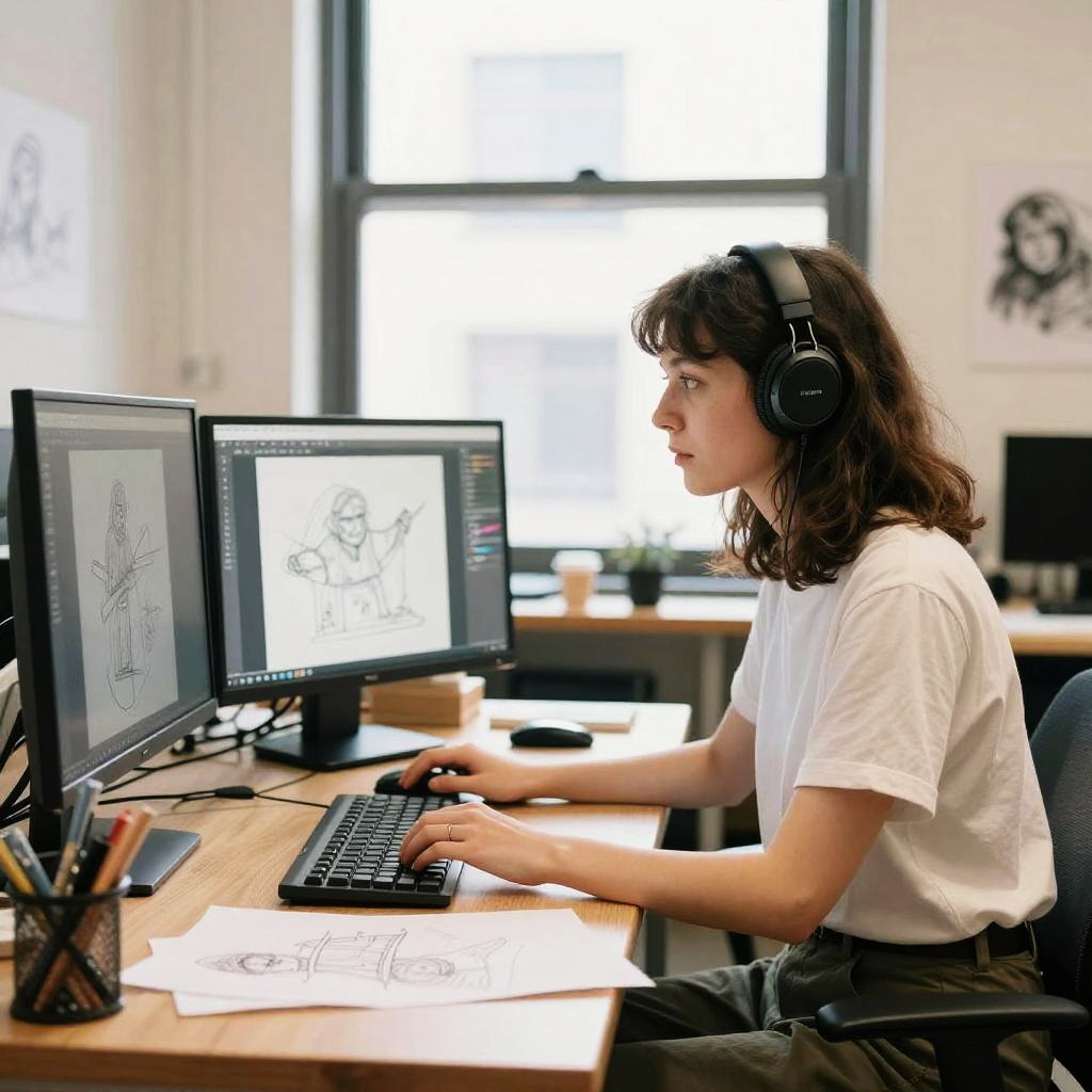 KiCad getting started scene with beginner electronics enthusiast drawing circuit diagrams on computer, cozy workspace with tools, dual monitors showing KiCad interface, warm lighting, modern digital illustration blending technology and creativity