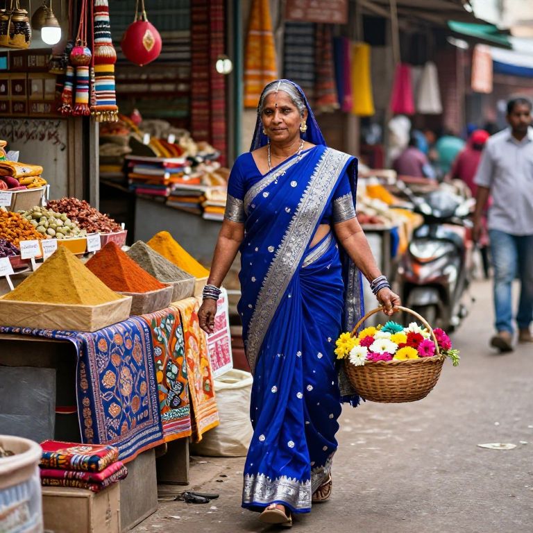 Aunty saree in deep blue silk with silver embroidery, walking through a bustling Indian market, vibrant stalls filled with spices and textiles, authentic street vibe, graceful posture, carrying a basket of fresh flowers, cultural richness and lively environment.