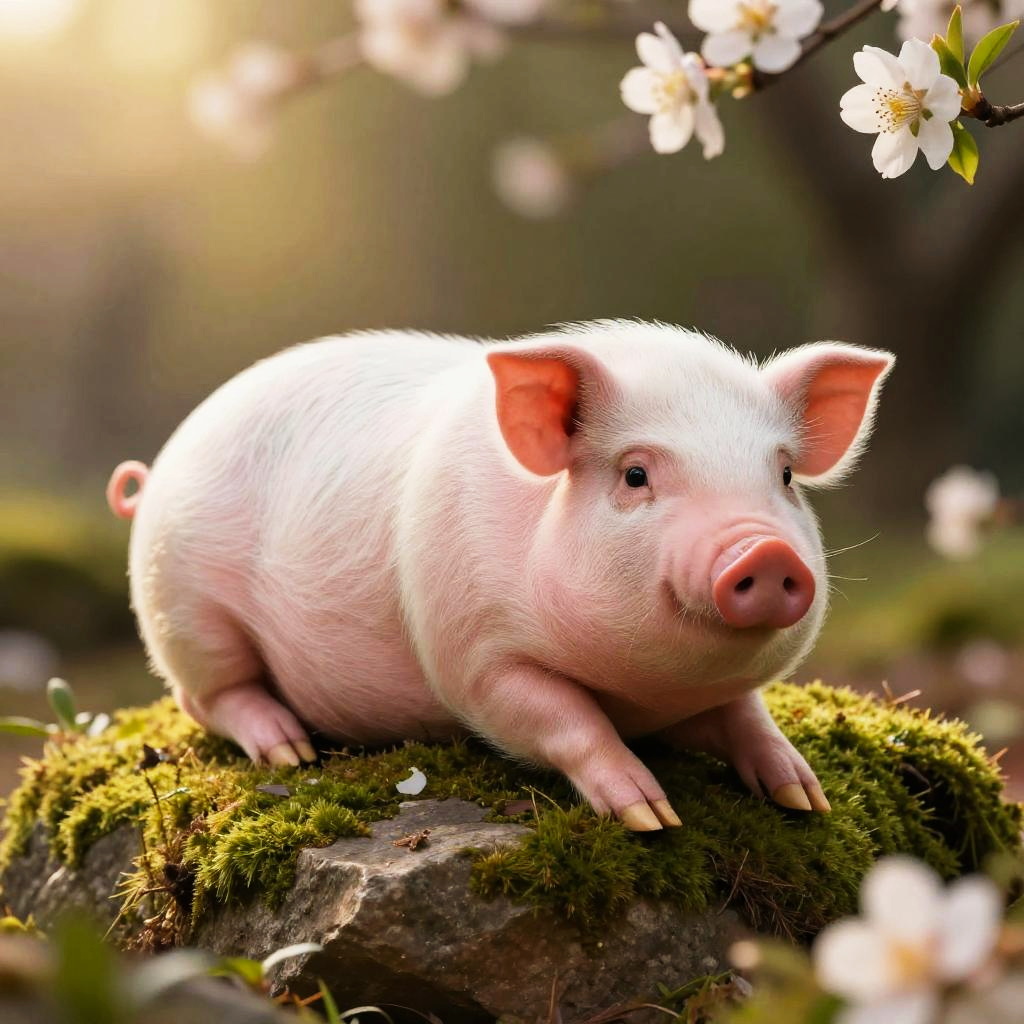 A playful pig cat hybrid curled up on a mossy rock, combining smooth pigskin texture and sleek cat fur, surrounded by blooming flowers under golden sunlight, enchanting and surreal atmosphere