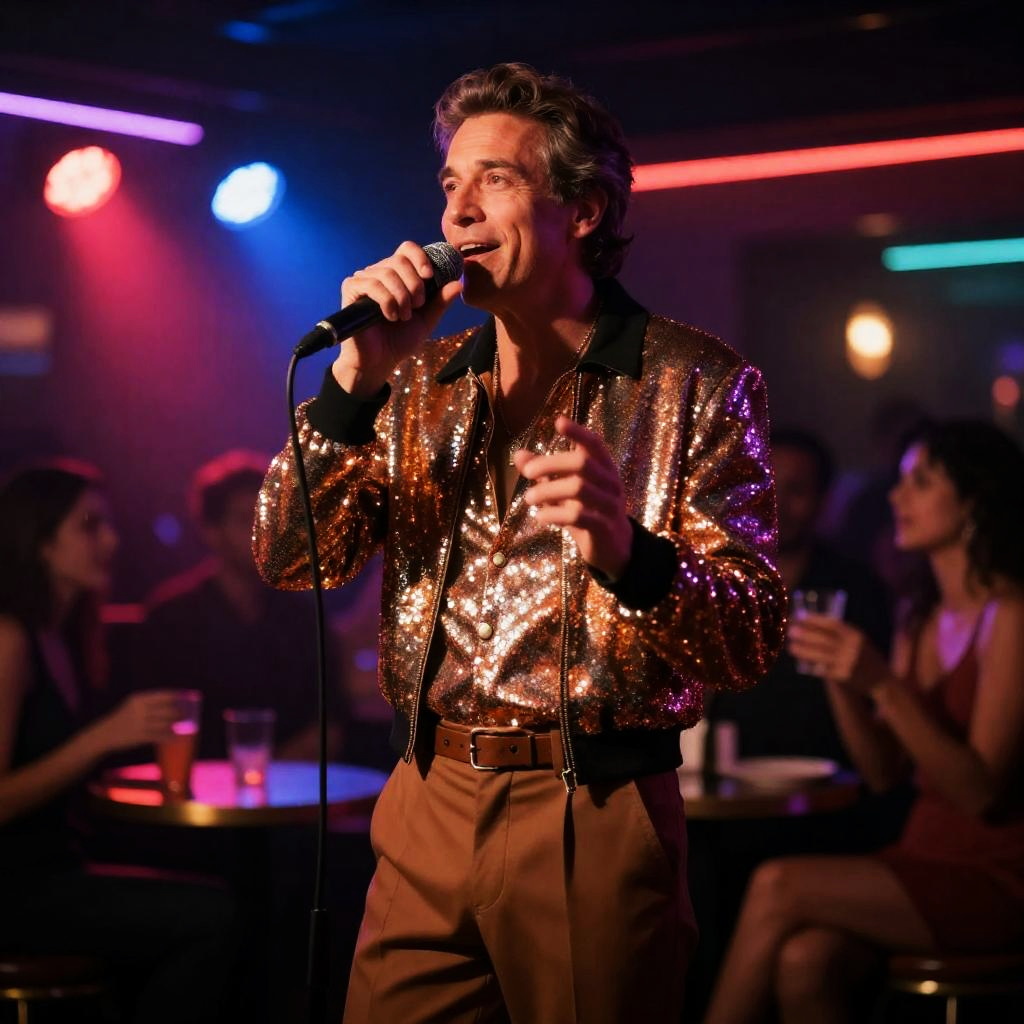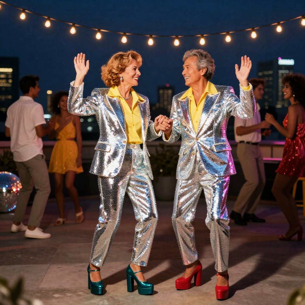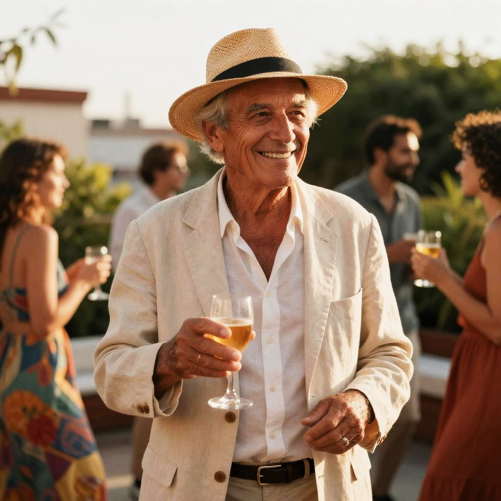 A cheerful group of friends with casual Hawaiian shirt enjoys a lively party in a tropical beach, surrounded by vibrant colors and soft shadows.