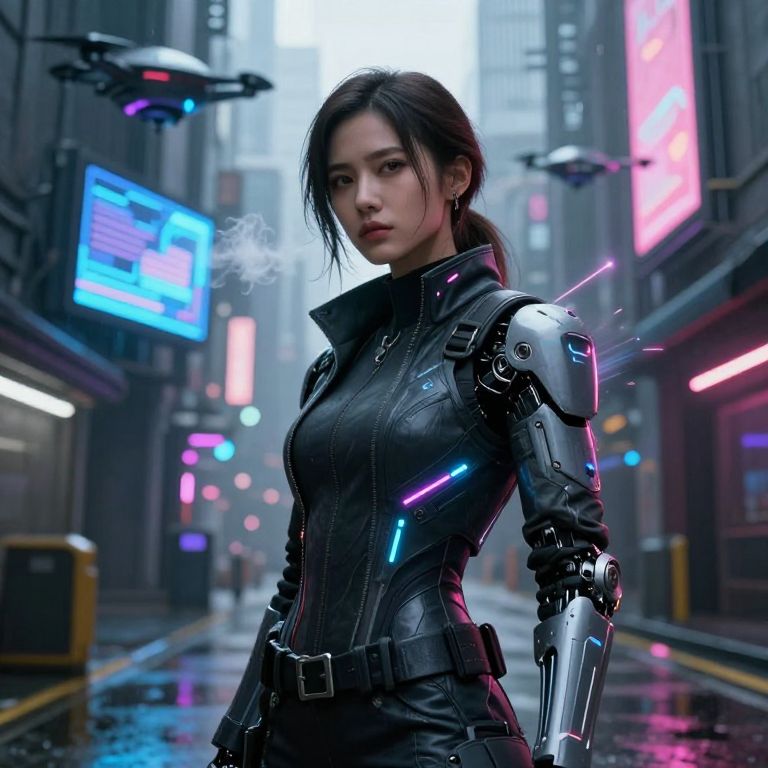A cyberpunk girl with an intense gaze and cybernetic enhancements on her left arm, wearing a high-fitting, form-fitting armor jacket with dynamic LED accents that respond to her breath and movement, standing in a dystopian alley where floating drones and holographic billboards cast shifting shadows over rain-slicked streets.
