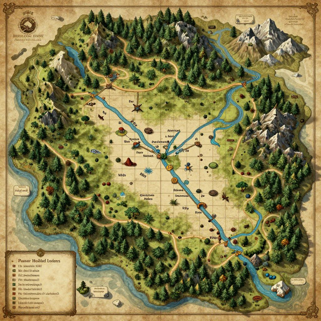 Dnd map generator 5e epic battle map, sprawling outdoor terrain with forests, rivers and mountains, tactical grid overlay, high detail, vintage cartography aesthetics, fantasy roleplaying game environment, rich textures and warm earthy tones
