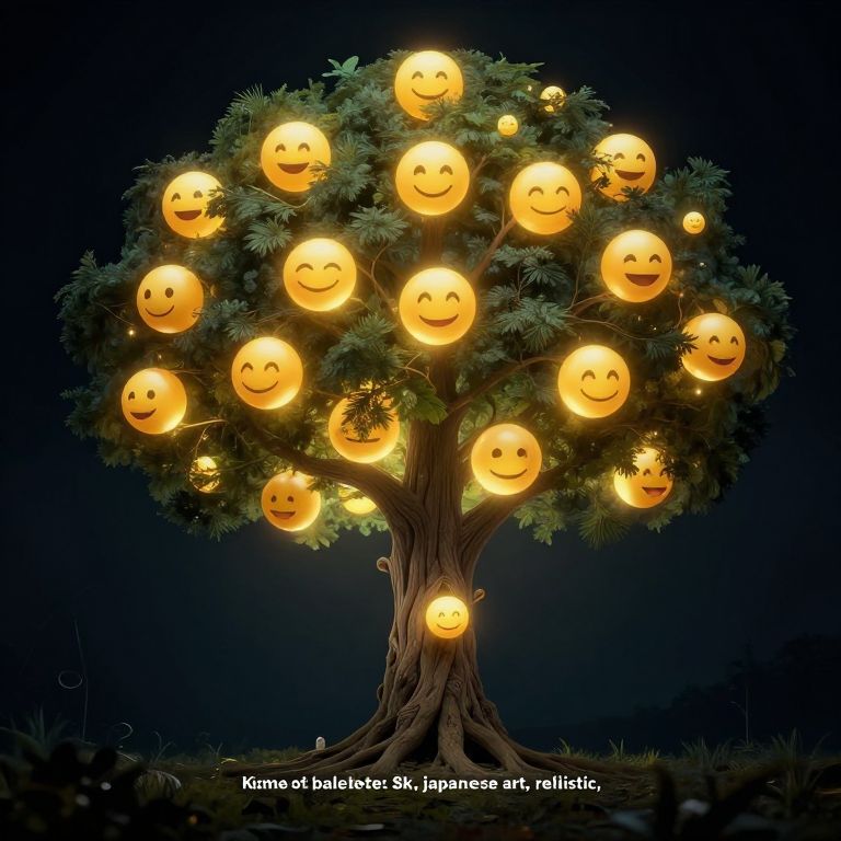 "Kawaii Emojis tree of life, surreal, mysterious, luminous, dramatic light, rich color palete, 8k, japanese art, realistic,"