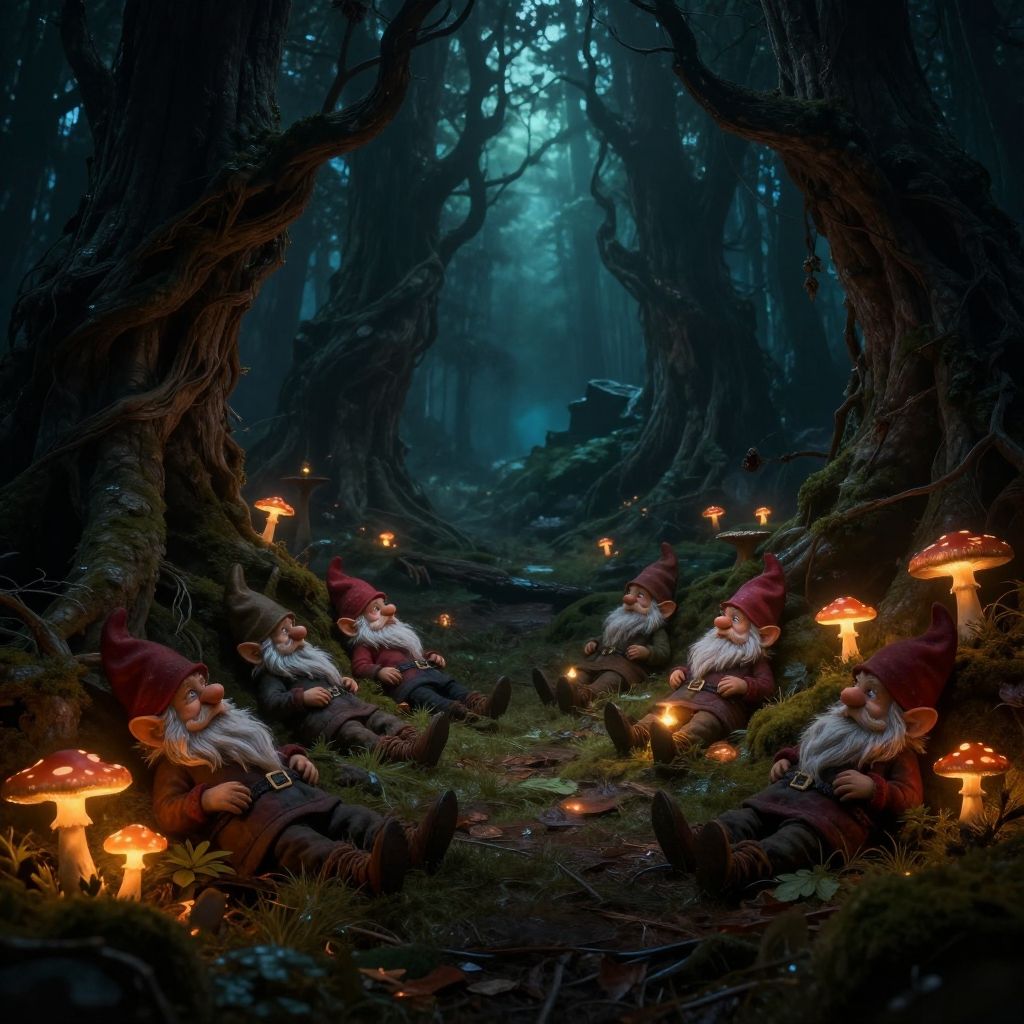 Dead gnomes lying in a mystical enchanted forest clearing, surrounded by glowing mushrooms and twisted ancient trees, eerie atmosphere, detailed fantasy art