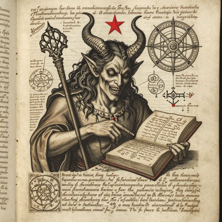 The image depicts an 18th-century occult manuscript, rich with intricate illustrations and dense handwritten text. At the center, a menacing figure with long, twisted horns and a sinister grin holds a staff and points to an open book, seemingly in the act of casting a spell. The figure's expression is one of malevolence, with a red star above its head, symbolizing its demonic nature. Surrounding the figure are various diagrams and symbols, including a complex geometric pattern and a wheel-like structure, suggesting a connection to esoteric knowledge. The text is written in a flowing, cursive script, with annotations and marginalia scattered throughout, indicating extensive study and commentary. The overall composition is dense and chaotic, with elements overlapping and intertwining, creating a sense of depth and complexity. The manuscript's aged parchment and the detailed illustrations evoke a sense of historical and mystical intrigue, capturing the essence of 18th-century occult practices.