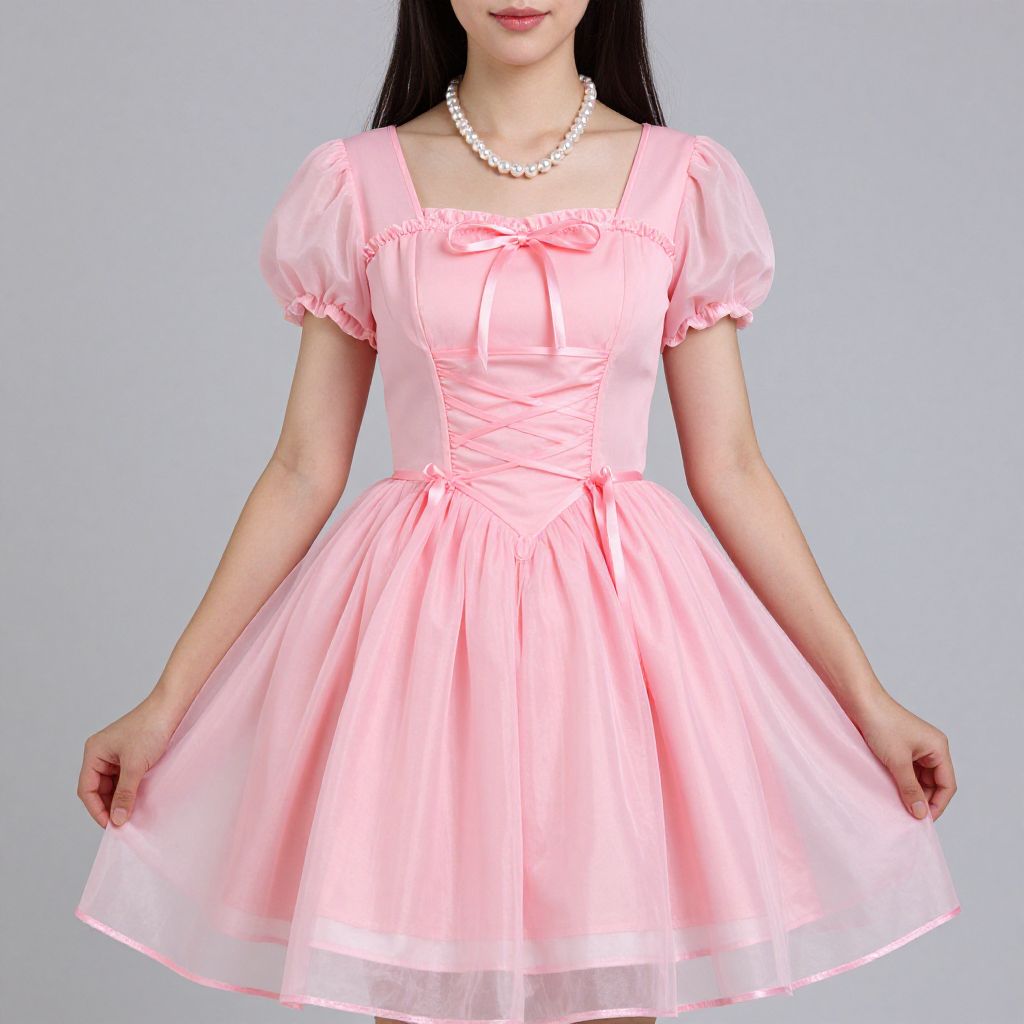 Photograph of an Asian woman with long black hair wearing a pastel pink, short-sleeved, A-line dress with a square neckline and bow tie detail at the chest. The dress features a fitted bodice with crisscross lace-up detailing and a flared, layered tulle skirt. She wears a white pearl necklace. Her arms are slightly bent, holding the skirt out. The background is a plain light blue, and the lighting is even, highlighting the dress's soft, delicate texture and gentle color. The woman's face is partially visible, showing a neutral expression.