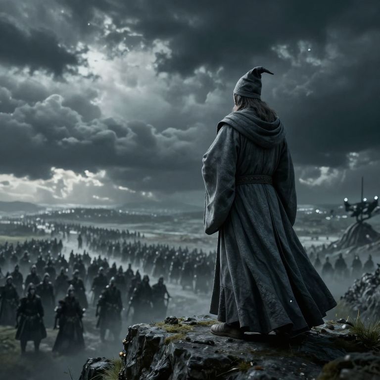 A wizard in gray robes stands on a mountaintop, observing an approaching army against a dramatic, stormy sky.