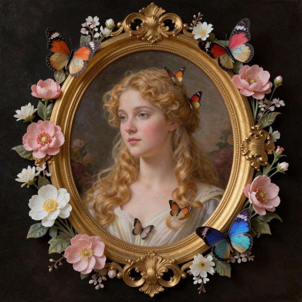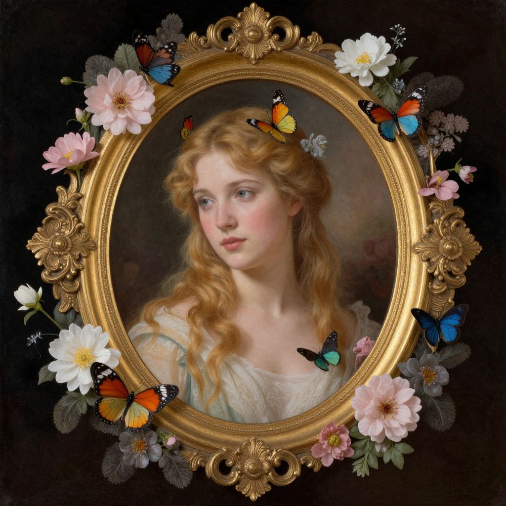 This is a digital painting depicting a young, fair-skinned woman with wavy, blonde hair adorned with a small floral crown, set in an ornate, gold-framed oval portrait. She has soft blue eyes and a delicate, serene expression. She wears a pale, off-the-shoulder dress with intricate lace details. Surrounding the frame are vibrant flowers, including white and pink chrysanthemums, and colorful butterflies in shades of orange, blue, and black. The background is a dark, muted gradient, highlighting the subject and the decorative elements. The overall style is reminiscent of classical portrait painting with a touch of romantic realism.