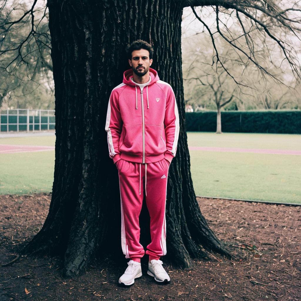 Pink Track Pants, man in pink tracksuit standing in front of a tree