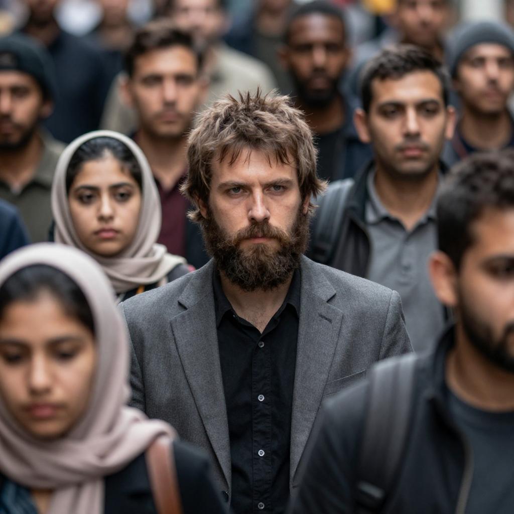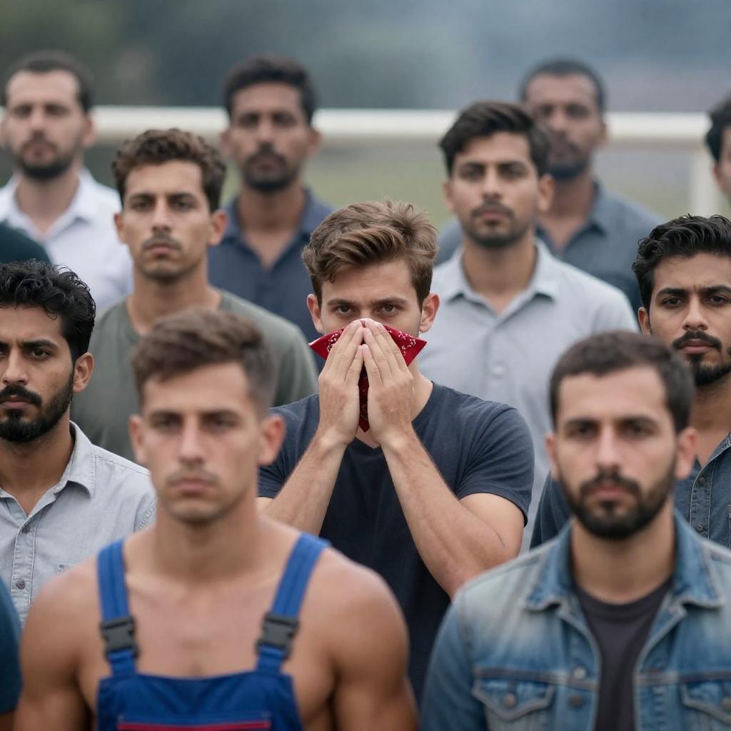 Photograph of a group of men in a stadium. Foreground: muscular man in blue overalls, short brown hair, serious expression. Center: man with red handkerchief, short brown hair, covering nose and mouth, intense gaze. Background: diverse men in casual clothing, various expressions. Blue overalls, denim jackets, collared shirts. Smoky atmosphere, blurred background. Men's varied hairstyles, beards, and facial hair. Crowd tightly packed.