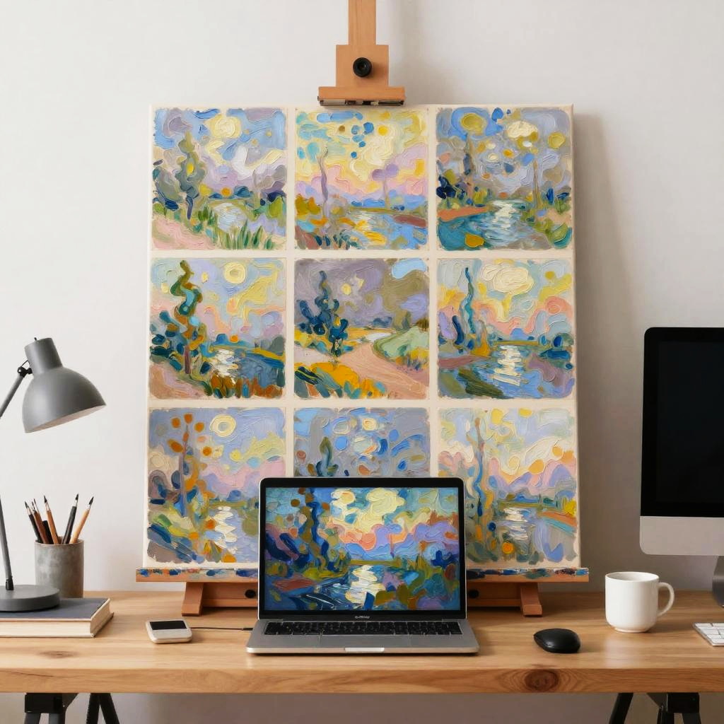 Free online AI art generator showcasing a digital canvas filled with impressionist style AI paintings, soft pastel tones blending naturally, artistic workspace with modern devices and ambient light enhancing a calm creative atmosphere.