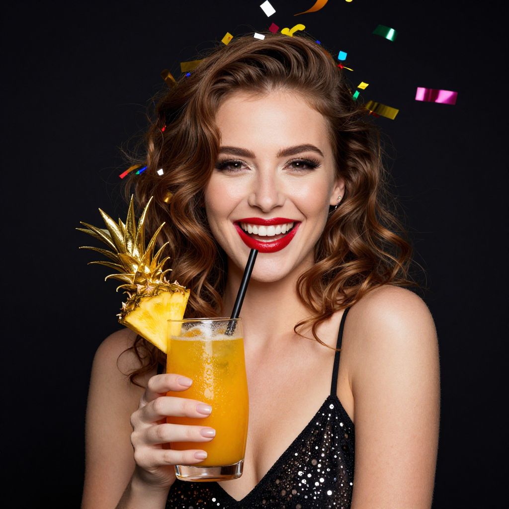 Woman smiling brightly while holding a vibrant orange cocktail garnished with a golden pineapple and a black straw, surrounded by colorful confetti floating above her styled hair.