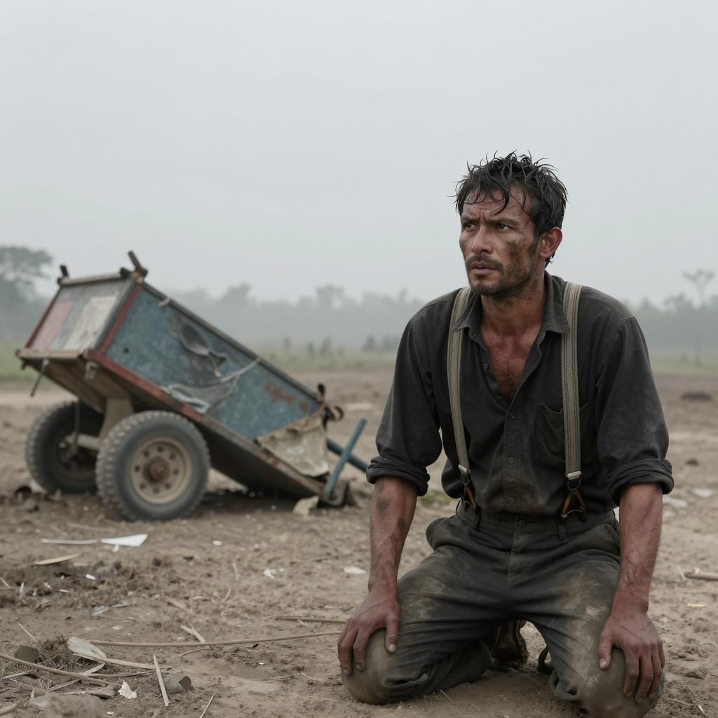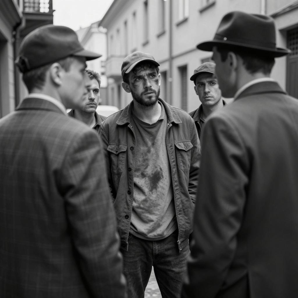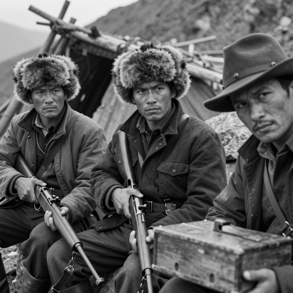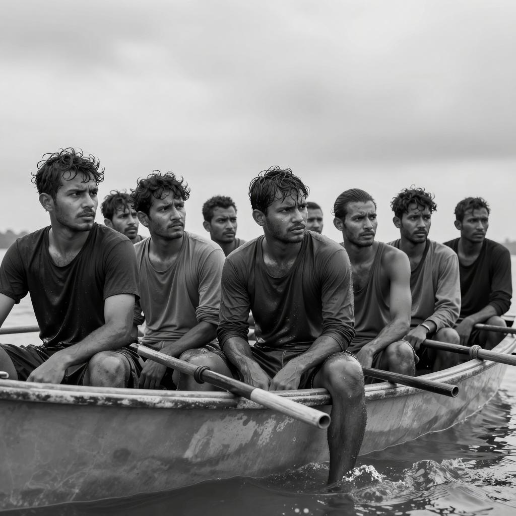 Black-and-white photograph of five dirty, disheveled men in a dark, cramped wooden boat. Three men attend to a wounded man's leg, while two others look on. Smoky atmosphere. Men wear dark, worn clothing. Wounded man sits with intense expression.