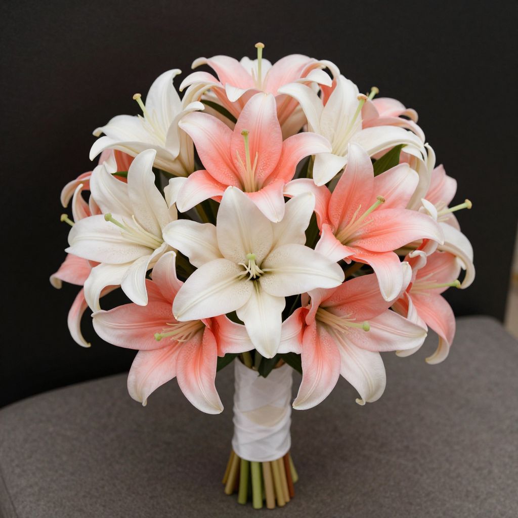 Photograph of a bridal bouquet featuring a mix of large, elegant lilies. The flowers are predominantly white with soft pink gradients, creating a delicate and romantic appearance. The lilies are tightly arranged and wrapped with a white ribbon around their stems. The bouquet is placed on a round, gray table against a solid black background, highlighting the bright and soft colors of the flowers. The lilies have prominent stamens and are in full bloom, displaying their intricate petal structures and subtle color transitions. The overall composition is simple yet striking, emphasizing the beauty and elegance of the bouquet.