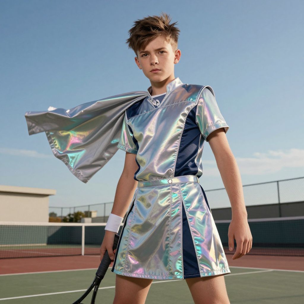 Young boy with spiked brown hair wears shiny silver and black tennis outfit, holding racket, on outdoor tennis court with clear blue sky. Photorealistic CGI