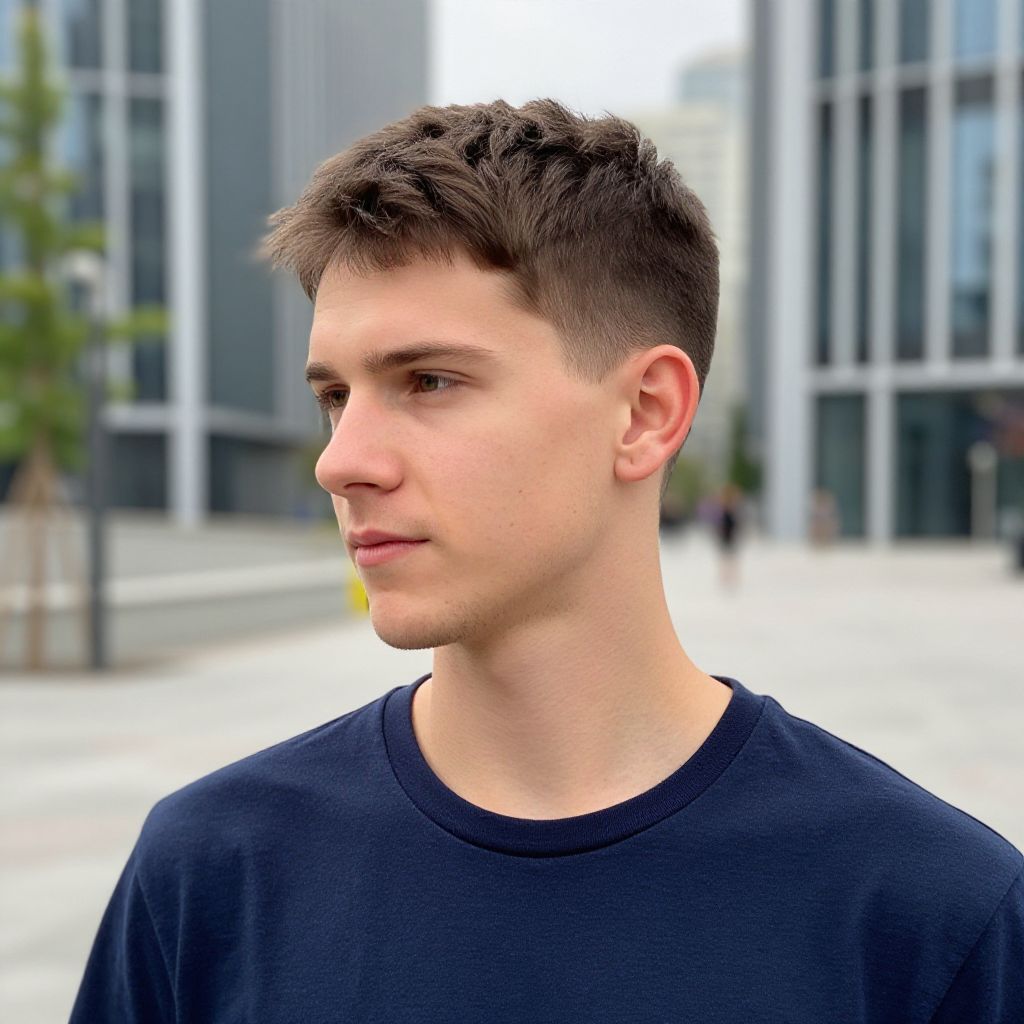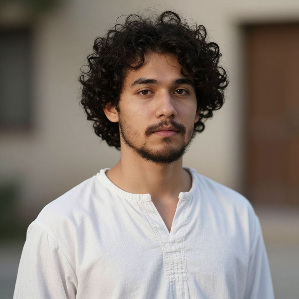 Curly natural hair, fit European man, realistic portrait photography, soft natural lighting, urban background