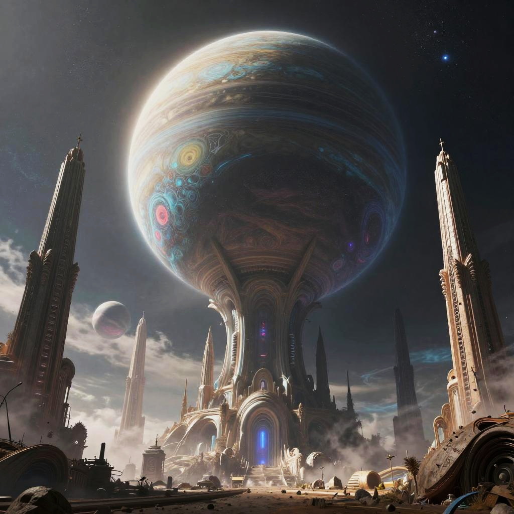 Alien-landscape, colossal-structures, chilling-atmosphere, exoplanet-weather, vertical-9:16-composition, awe-inspiring-vistas, hyper-realistic-textures, breathtaking-lighting, trending-on-artstation, award-winning-capture, Canon-EOS-R5, 8k-resolution, serene, no-humans, gas-giant-rising, floating-spires, vibrant-colors, ethereal-sky