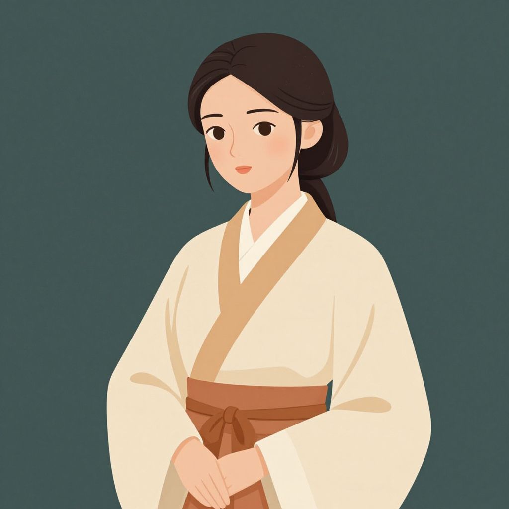 This digital illustration features a young Asian woman with fair skin and black hair styled in a neat bun. She is dressed in a traditional Korean hanbok, consisting of a light green top with white sleeves and an orange skirt with a brown belt. She wears simple gold earrings. The background showcases a traditional Korean-style window with a grid pattern, set against a white wall. The ground is light gray, and there is a hint of greenery in the top right corner. The woman stands centrally, looking slightly to the left with a gentle smile. The art style is clean and minimalist, with smooth lines and a pastel color palette.
