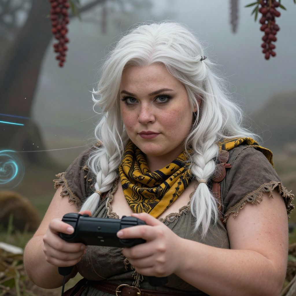 (designed by John Constable:0.9) and (Rembrandt van Rijn:0.7) and (WLOP:0.9), portrait, award winning, close up of a stout Australian (Katarzyna:1.3), Katarzyna is Playing video games, she is very Vampiric and Remarkable, she is cosplaying as Freyja, she is feeling very smug, concept art, she has White hair, she has a Unforgettable South-American dark yellow Tartan Scarf, Anime Eyes, Folk space with Locust, Foggy conditions, soft focus, Dynamic, Sci-Fi, Yuccie Art, Starlight, 800mm lens, Velvia, magnificent and charming, quantum wavetracing, realistic pretty face, freckles, unreal engine, wallpaper