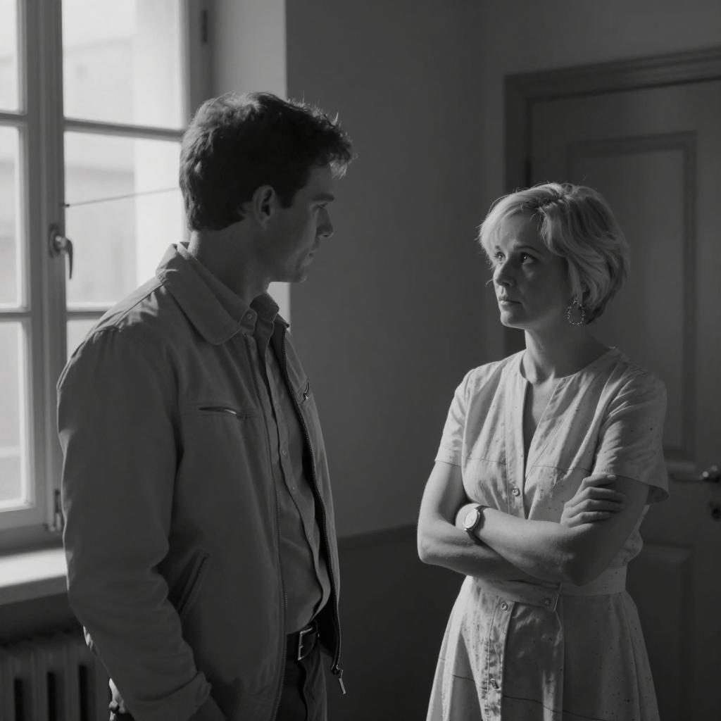 Black-and-white photograph of two people. Man with short dark hair, light jacket, and collared shirt stands left, facing woman with short blonde hair, light dress, arms crossed, standing right. They are in a dimly lit room with a window and a door. Man's expression is serious, woman's expression is neutral. Light source is above them.