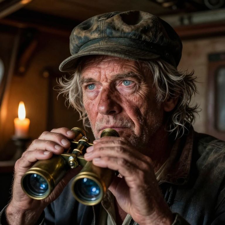 Craft a photorealistic portrait photograph of a solitary sailor in his late 40s, showcasing rugged skin weathered by the sun and unfocused blue eyes. His expression exudes weariness yet resilience as he stares into the distance beneath his worn fisherman's cap. Framed by tousled salt-and-pepper hair, fine lines etch across his face, a testament to years spent at sea. The dimly lit cabin interior serves as the backdrop, with flickering candlelight casting dramatic shadows on his furrowed features. Capture this scene through an antique brass spyglass's unique perspective, imbuing the portrait with an air of introspection and mystery, revealing the sailor's inner thoughts and untold tales.