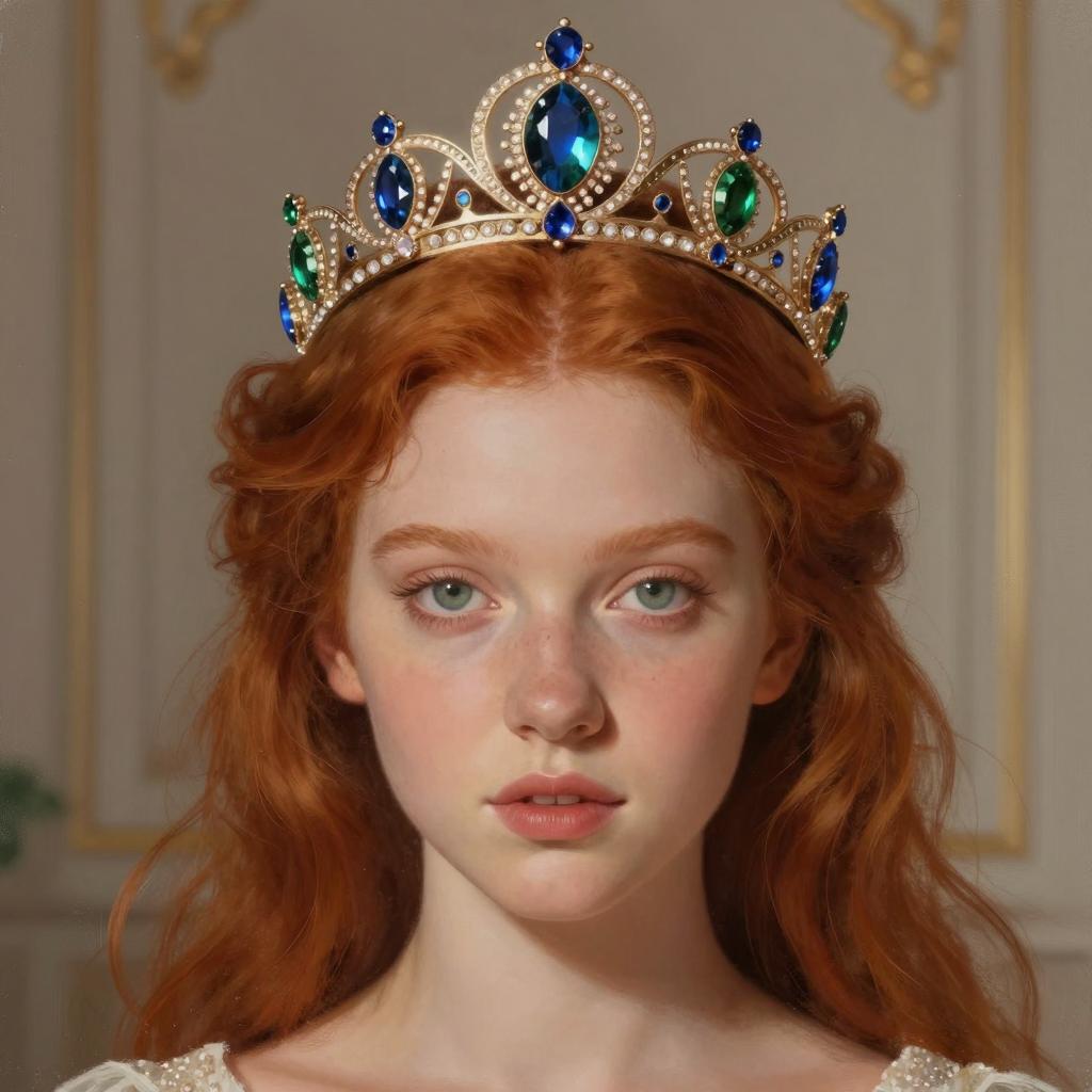 Digital painting of a young woman with red hair wearing an ornate metallic tiara adorned with blue and green gemstones. The portrait features highly detailed facial features, smooth skin, and dynamic lighting, set against a softly blurred elegant interior background.