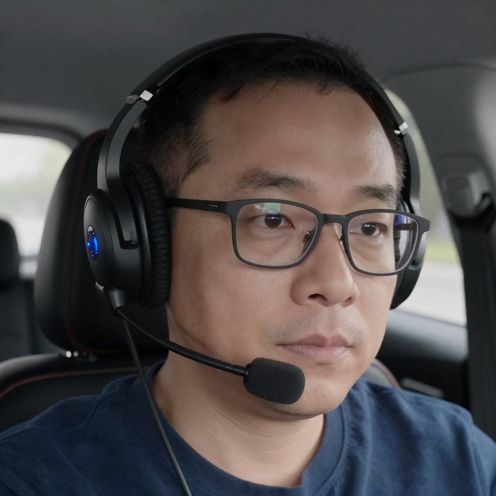 Close-up photograph of a middle-aged man with light skin, wearing black-framed glasses and a headset with a microphone. He has a focused expression, blue shirt, and is seated in a dimly lit vehicle. The background is blurred, emphasizing his serious demeanor. The headset's lights are blue.