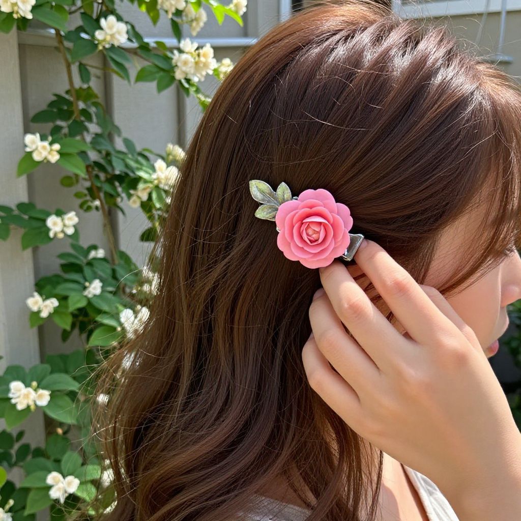 A close-up photograph of a young woman with soft brown hair, gently placing a delicate floral hair clip into her loose strands. The hair clip features a vibrant pink rose with tiny green leaves, set in a tarnished silver frame. The setting is a sunny morning in a suburban garden with blooming jasmine vines in the background.