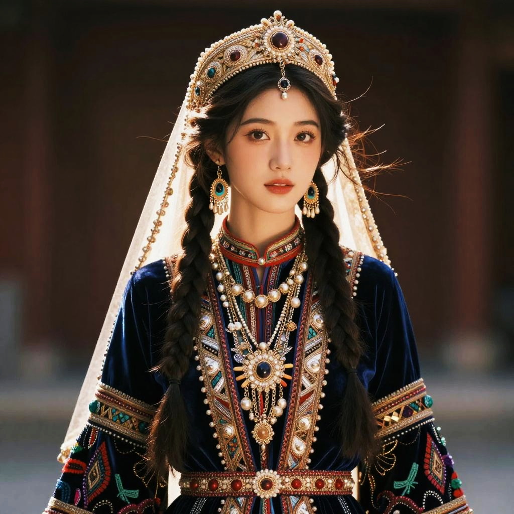 Photorealistic digital portrait of an East Asian woman in ornate traditional dress, adorned with gold jewelry and intricate embroidery, wearing a detailed crown and veil