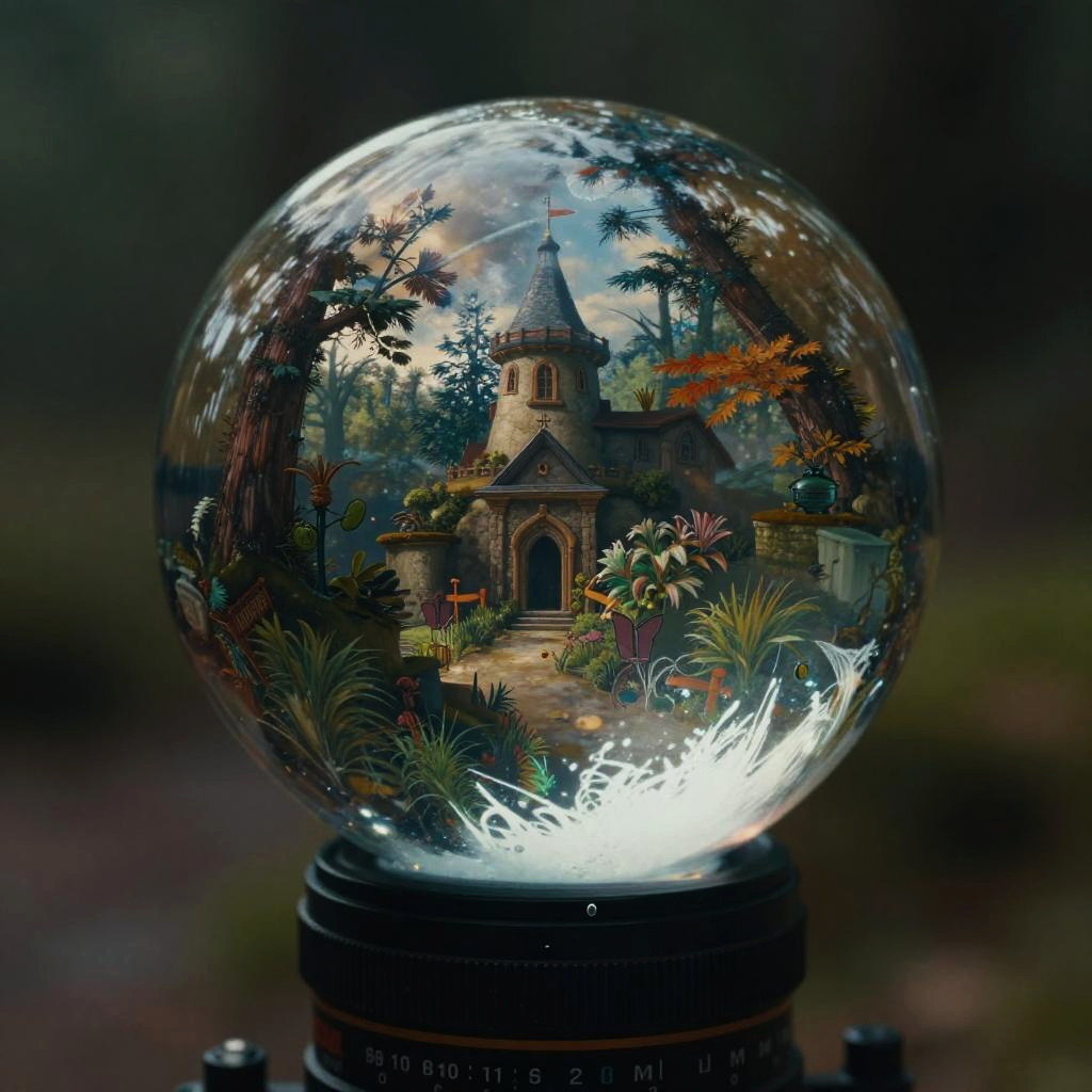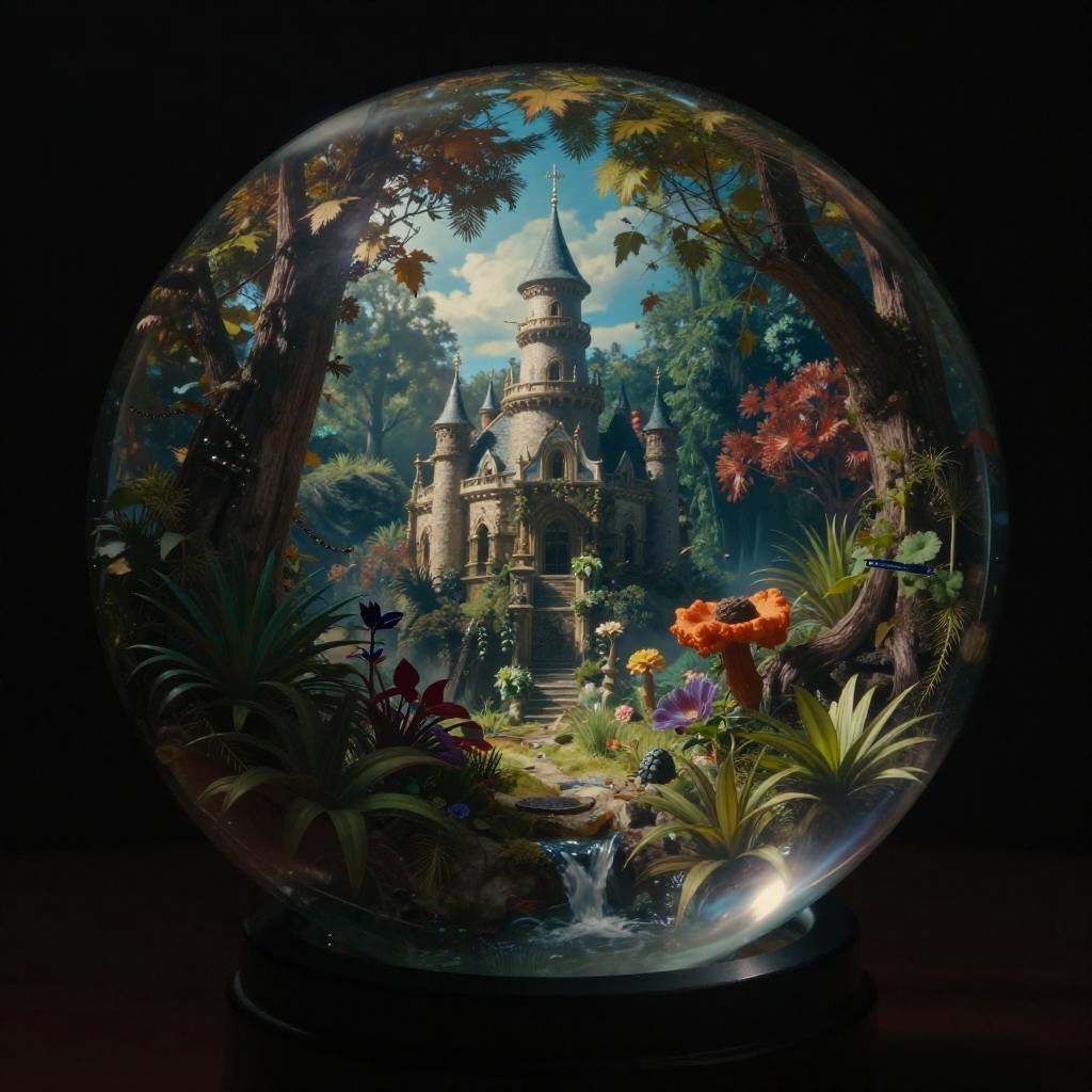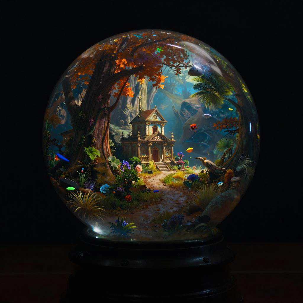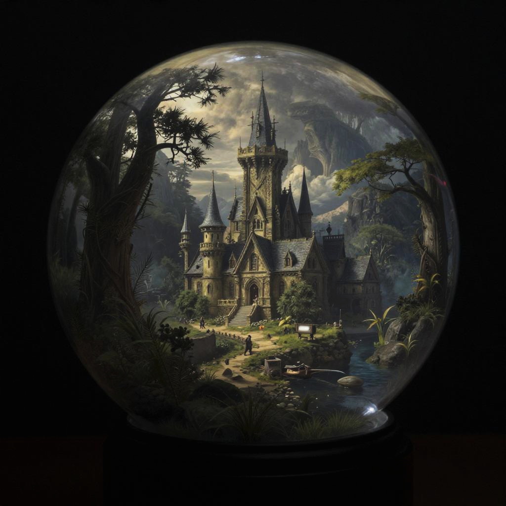Thomas Cole fantasy world in a transparent glass ball, epic, colorful, gloomy, contrast, photo-realistic, cinematic shot, Zeiss ZX1, meticulously detailed environment, professional lighting, moody atmosphere, bright with depth, 55mm to 100mm lens range, noir style toning, long exposure, high resolution