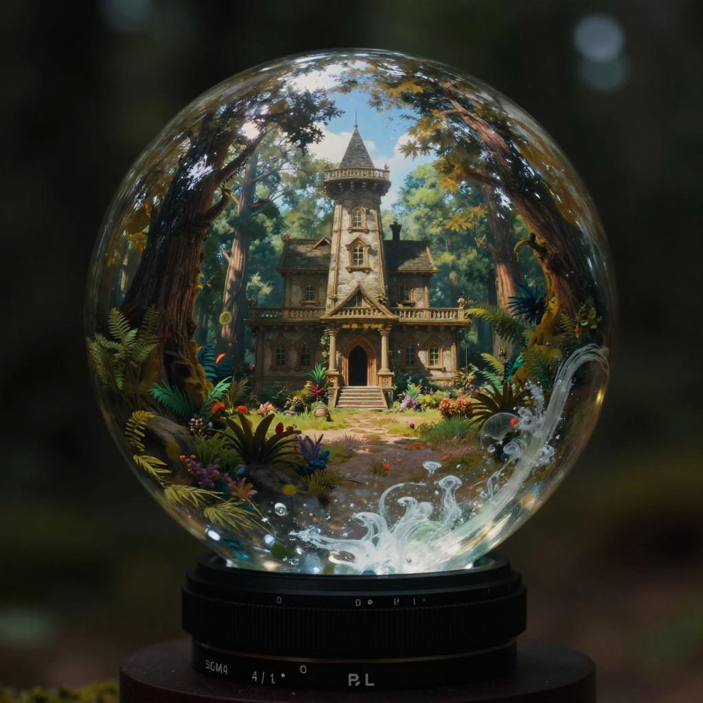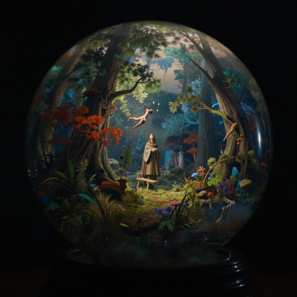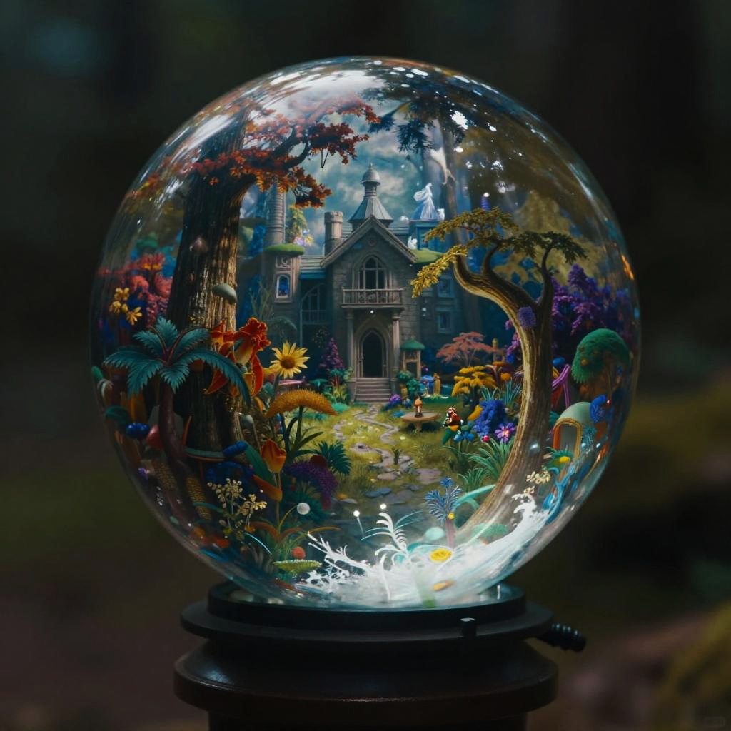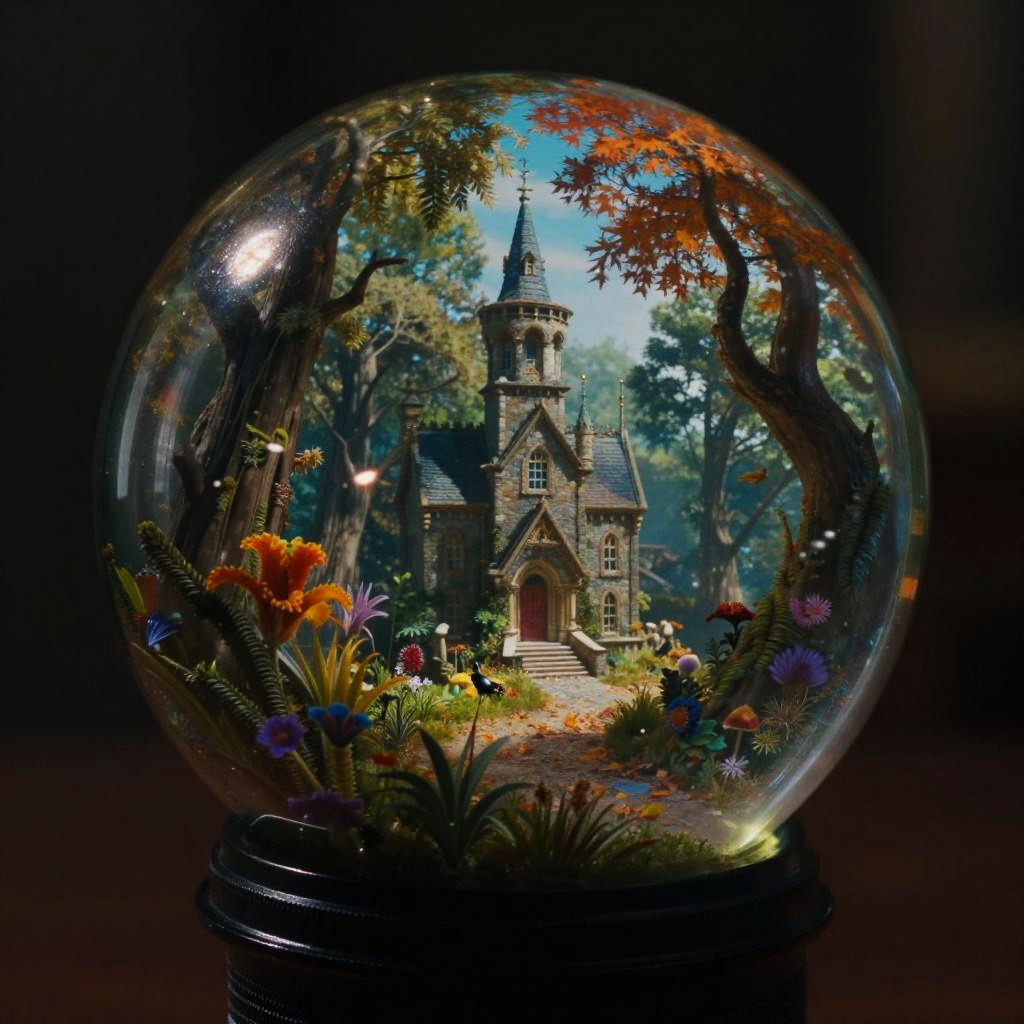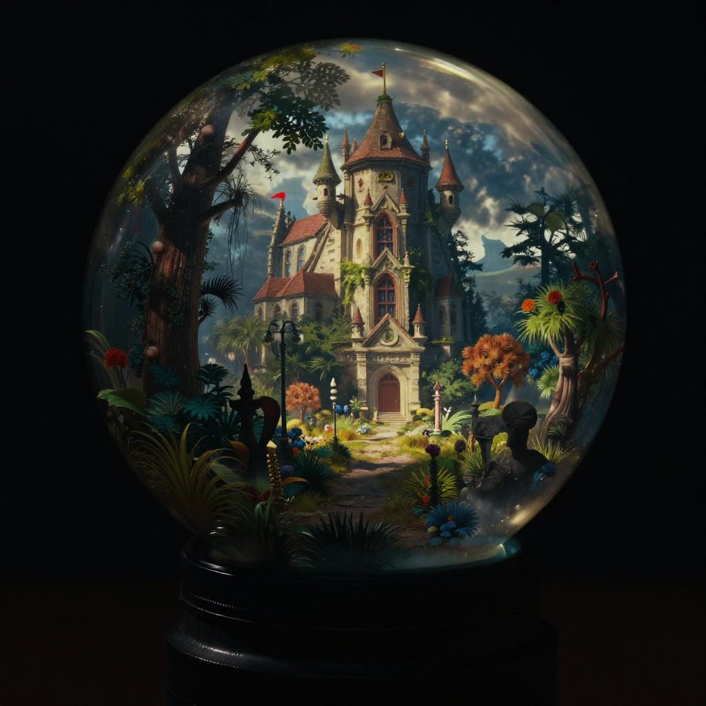 Thomas Cole fantasy world in a transparent glass ball, epic, colorful, gloomy, contrast, photo-realistic, cinematic shot, Zeiss ZX1, meticulously detailed environment, professional lighting, moody atmosphere, bright with depth, 55mm to 100mm lens range, noir style toning, long exposure, high resolution