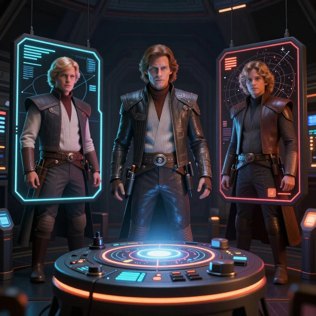 Star Wars character generator concept, a futuristic device projecting three-dimensional avatars of various Star Wars characters in a dark room filled with star maps and technology, intricate costume details, glowing interfaces, richly colored lights, sci-fi fantasy vibe